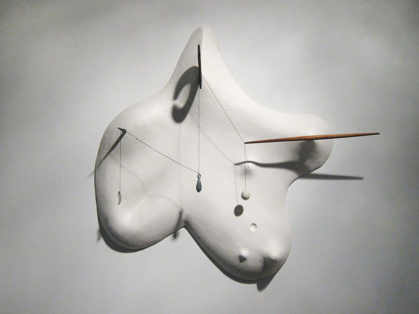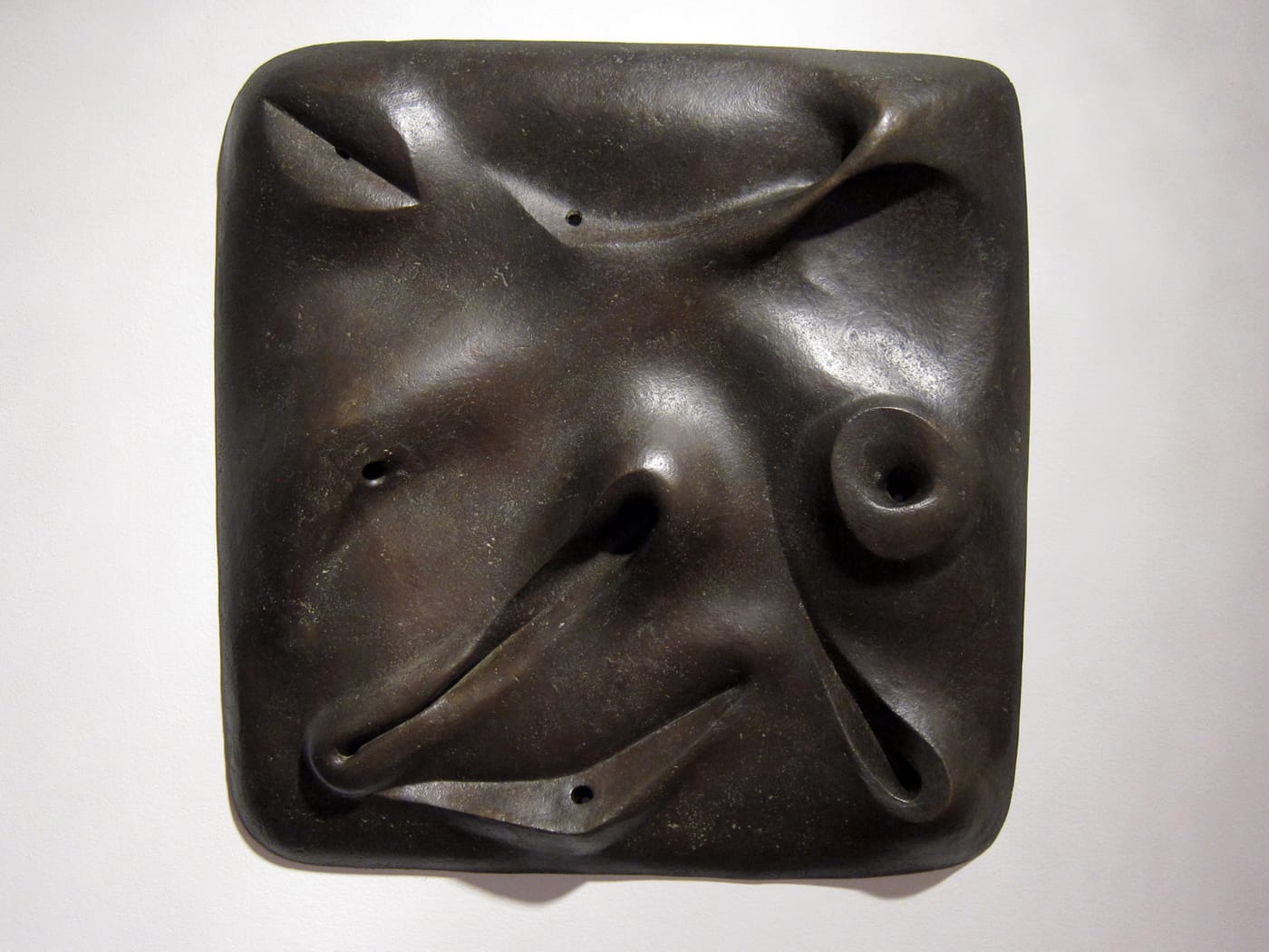 That weariness evolved into deep frustration and anger with the nation’s treatment of its immigrants, which he channeled into his works. The sculptures made immediately after his exit were explicitly political, exemplified by a pair of works on one wall. “Yellow Landscape” (1943), composed of delicately balanced wood and fishing weights on string, depicts a world filled with anti-Asian sentiment, in a constant state of precariousness. “This Tortured Earth” (1942-43) resembles punctured, disfigured skin; it’s a proposal for an earthwork, depicted from above, with the land to be scarred with deep pits and lacerations by bombardment.