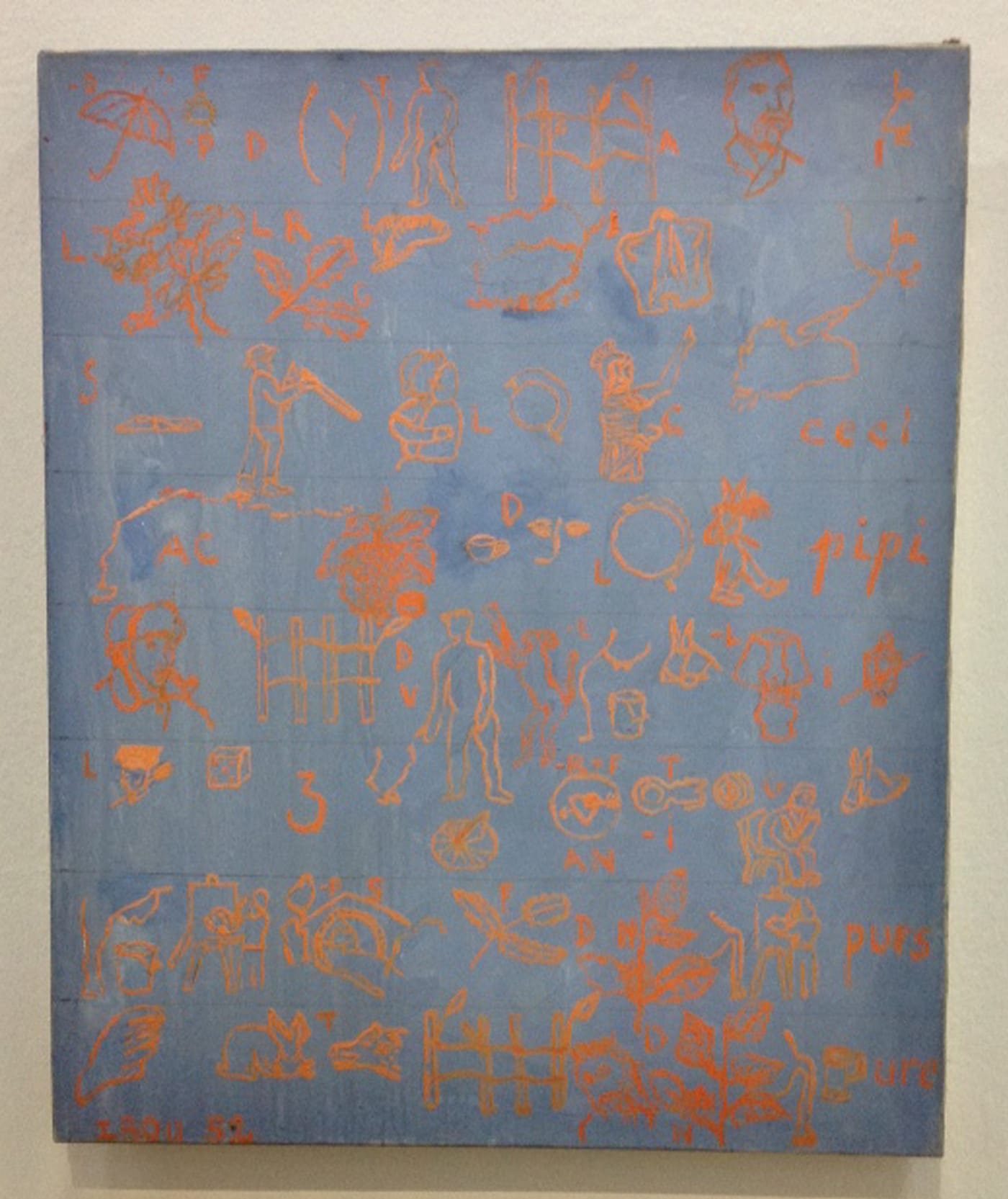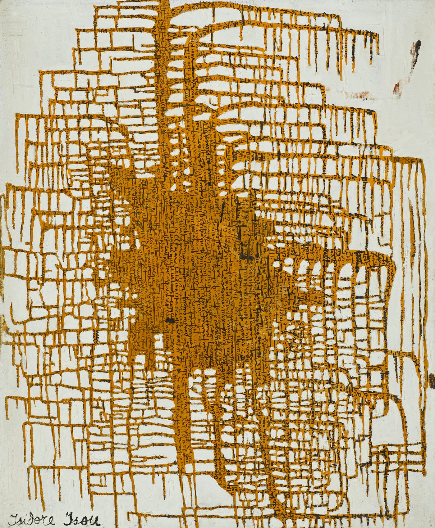 Certain of Isou’s Letterist poems achieved notoriety not for their performed vocal dexterity and lyricism, but because of the quality of their graphic design, as seen in his hybrid photo-paintings series “Amos ou Introduction a la metagrapholgie” (1952). Isou’s rhythmic linguistic-conceptual approach to painting often yielded gratifying results, as seen in “Incrustations dans le Brouillard” (Inlays in the Fog, 1961), a creamy fog painting embedded with a whirl of scribbles; “Réseau centré M67” (M67 Centered Network, 1961), a tan painting that drips in every direction; and the conceptually challenging “Telescripto-Peinture” (Telescripto-Painting, 1963-1987), basically some sort of telematic machine, resembling a typewriter, designated to be a painting in its own right.