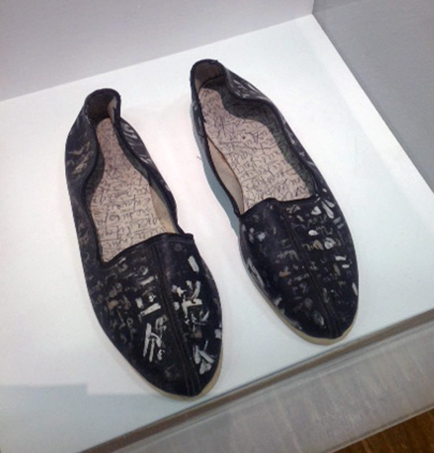 Letterism, therefore, was an optimistic endeavor: an innovative process by which humankind might develop a new means of communication not necessarily based on words. Simultaneously theoretical and practical, aesthetic and political, the Letterism project was a gesamtkunstwerk (total-art) that strove to free society from its reliance on conventional linguistic structures. Isou envisioned a formal revitalization of art and life through refiguring the power of the letter, a revitalization so vast as to cover the land: a point cheekily concocted by Isou’s “Sculpture Hypergraphique (Polylogue)” (1964), a pair of what appear to be black Chinese-style slipper-shoes that have been marked with hypergraphs (scribbly abstract letterforms) from toe to heel.