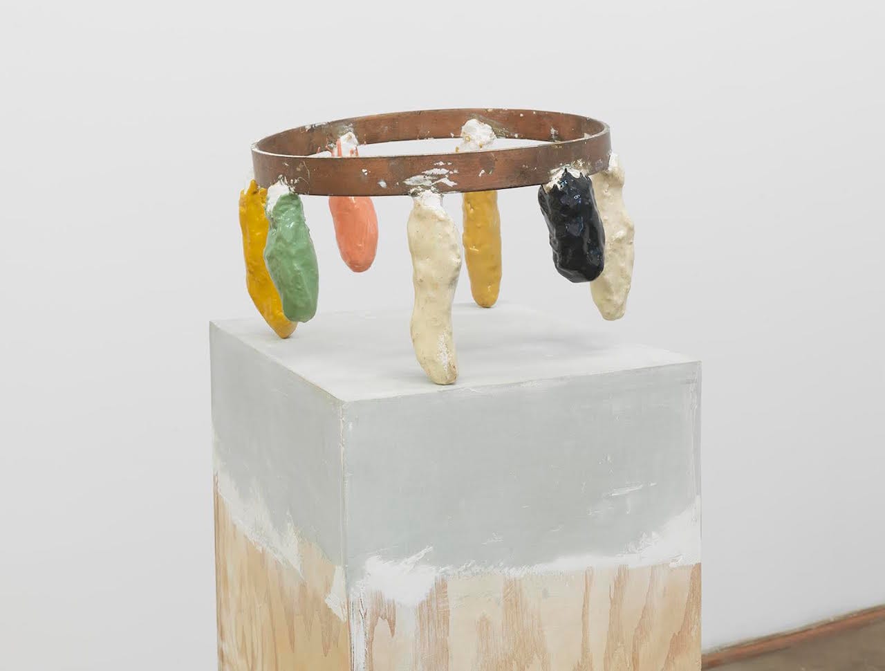 Like words in a sentence, the meaning that items attain is determined by the context in which they have been placed. While the framework in which Strzelec works is derived from modernist sculpture, and such formal issues such as the pedestal and the object, he has pushed this potentially stultifying constraint in an unlikely direction, exposing a host of commonplace assumptions. Within the context established by Strzelc’s sculptures, the possibilities of indirection have been achieved. Each item in his sculptures has a distinct identity. Their surfaces invite our touch, while their trompe l’oeil discrepancies remind us that knowledge depends upon physical and visual apprehension. Humor and disquiet overlap, becoming impossible to disentangle. A sense of nameless horror rises from the work, tempered by a sharply funny eye, inducing a faint vertigo in the viewer. And, as with all really interesting art, it is anti-ideological and inexhaustible, not something that can be trapped in familiar discourses. Following on the heels of his exhibition in 2013, this one marks his arrival as a strong presence in the scene.