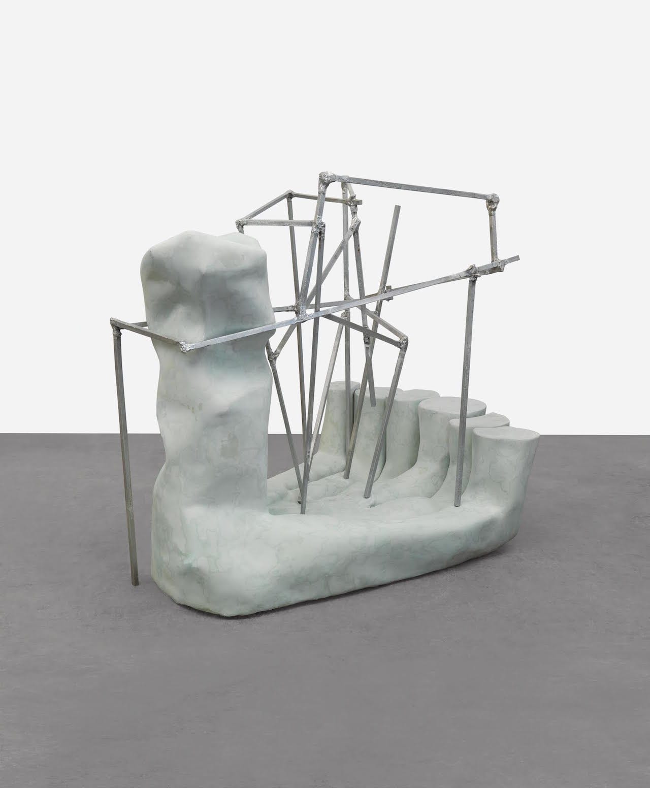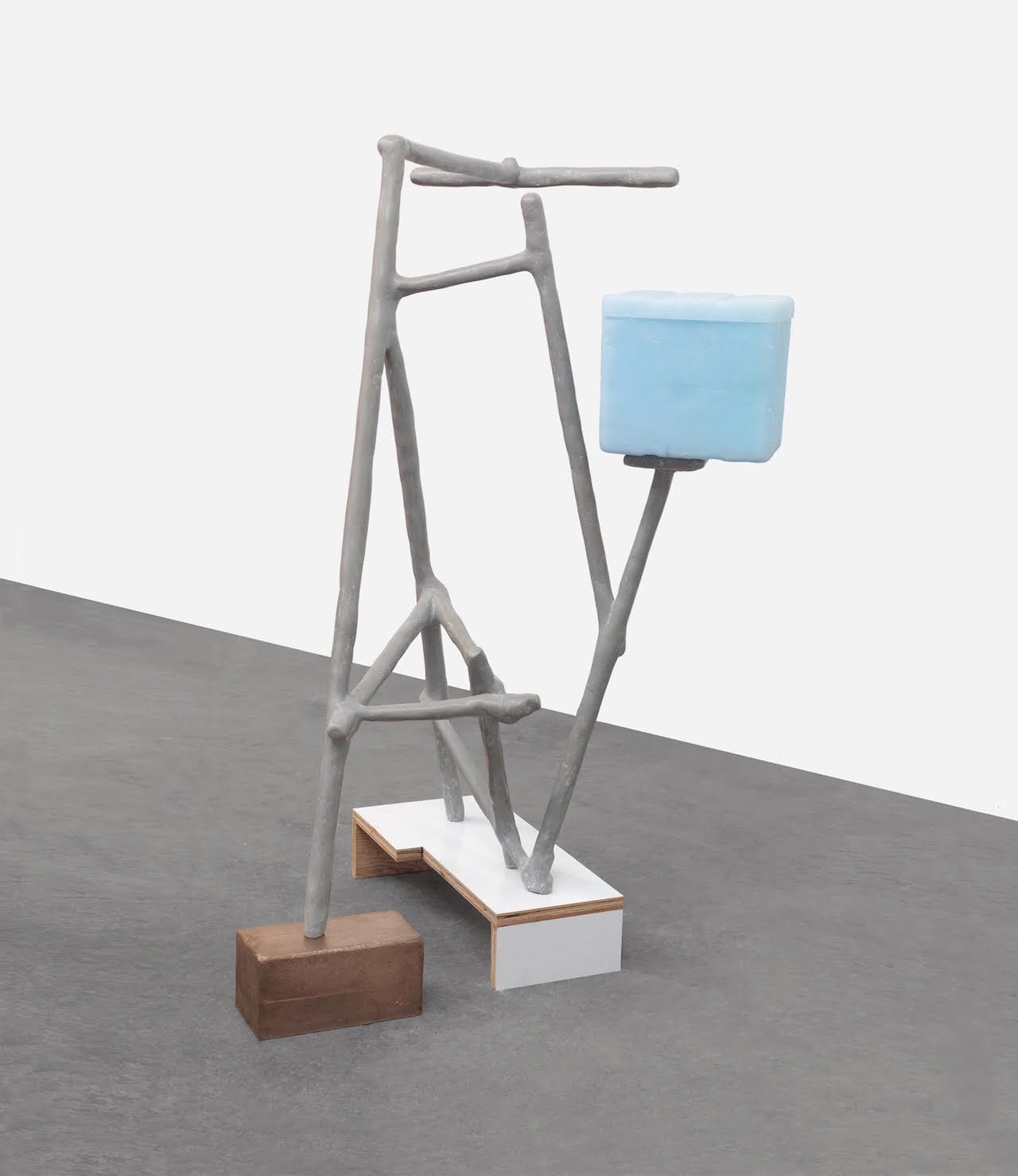 There are some wonderful slippages in the work. In “St. Peter,” a Styrofoam cooler has been cast in pale blue plastic, maintaining the shape of the original while establishing a noticeable difference. One leg of the cast aluminum support rests on a bronze cast of what appears to be a concrete block. The recast Styrofoam cooler, sitting on a small platform of a diagonal cast aluminum bar, suggests that “St. Peter” is an impractical though functional object. Here we might wonder about the relationship between pedestal and object, which Strzelec investigates in all of the sculptures in the exhibition. We might also expand our curiosity and consider all the different forms of presentation and limited function that are an intrinsic part of our lives, from shelving units to hat racks and sideboards. However, instead of repeating himself or offering variations on a theme, Strzelec keeps opening up the possibilities of stacking one thing on another.