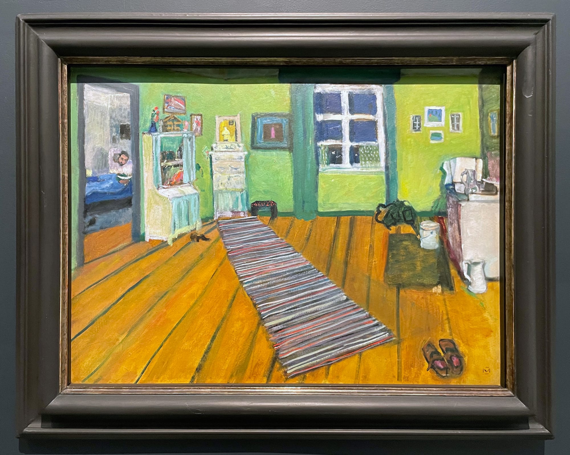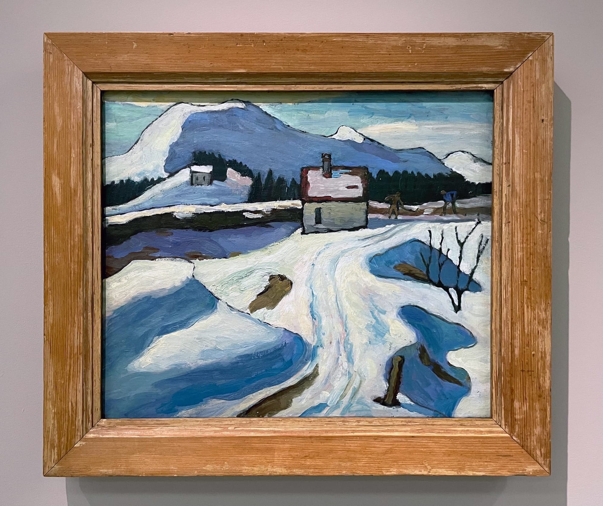 Münter’s landscapes can be more dizzying. “House with Fir Trees in the Snow” (c. 1938) crowds vertical elements — thin trees in the top half, two posts bookending two boulders at the bottom — into a vertical canvas. A house just below the center sits on a slightly diagonal horizon line. Its gabled roof reflects the shape of both the boulders and the white lines of snow on the trees. The whole feels vertiginous, as if Münter is stretching our gaze upward, while the boulders have a Rückenfigur effect, heightened by the house’s windows that look back at us like eyes. Another winter scene, “Snowy Landscape with a Red-Roofed House” (1935), seems like it’s about to slip off the canvas, its curving diagonal lines cutting through the snow and rushing out toward us. Meanwhile, the showstopper “Living Room in Murnau (Interieur)” (1910) turns an unoccupied room into a cacophony of saturated lime green and ocher, sharp angles, and bold diagonal lines; on the far left, a figure — Kandinsky — reclines in the flattened space of an improbably small bedroom. It all somehow feels both small and large. (I’ve been there and my memory of it is as skewed as the painting’s geometry.) Looking at the image made me feel like I was in motion.