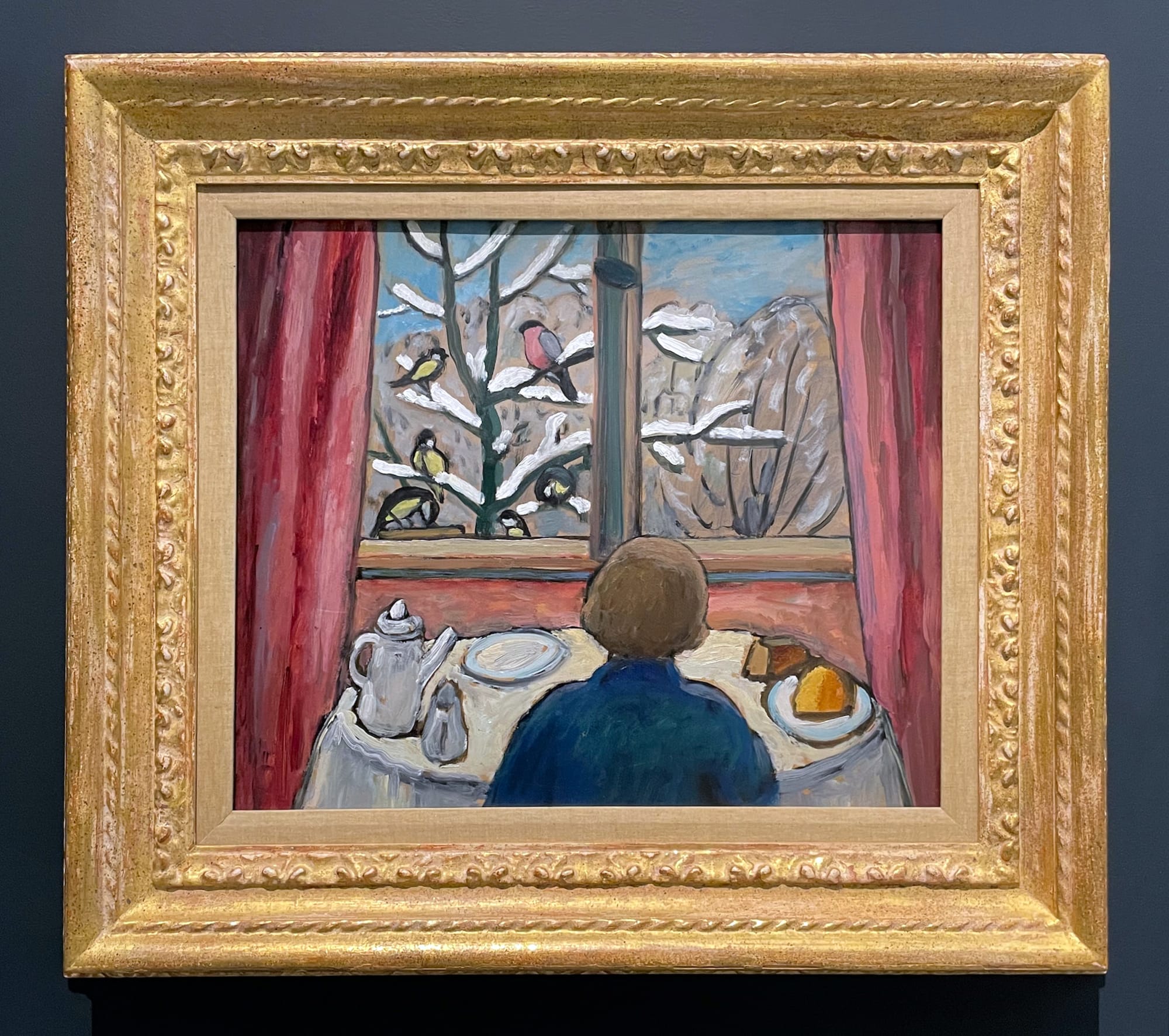 That act of viewing structures the gorgeous “Breakfast of the Birds” (1934). A figure seen from behind (probably the artist) sits at a table in front of a window that looks out onto a wintry, bird-lined tree. The sitter is a version of the Rückenfigur, a stand-in for the spectator. The device was made famous by Caspar David Friedrich, who wanted audiences to contemplate the sublime vistas he recorded. Münter trades Friedrich’s grandeur for intimacy and warmth; we’re contemplating a table with what I like to think is tea and a slice of gugelhupf, and a glimpse of nature dominated by resting birds on a spindly tree. Diverging from Romanticism’s open space and dramatic lighting, she creates depth by layering elements: The centered figure sits lowest in the pictorial space, in front of the table, followed by the wall and then the tree. The composition positions the museum-goer as another element in the sequence, while curtains framing the window evoke a theatrical stage, as if we’re watching a play.