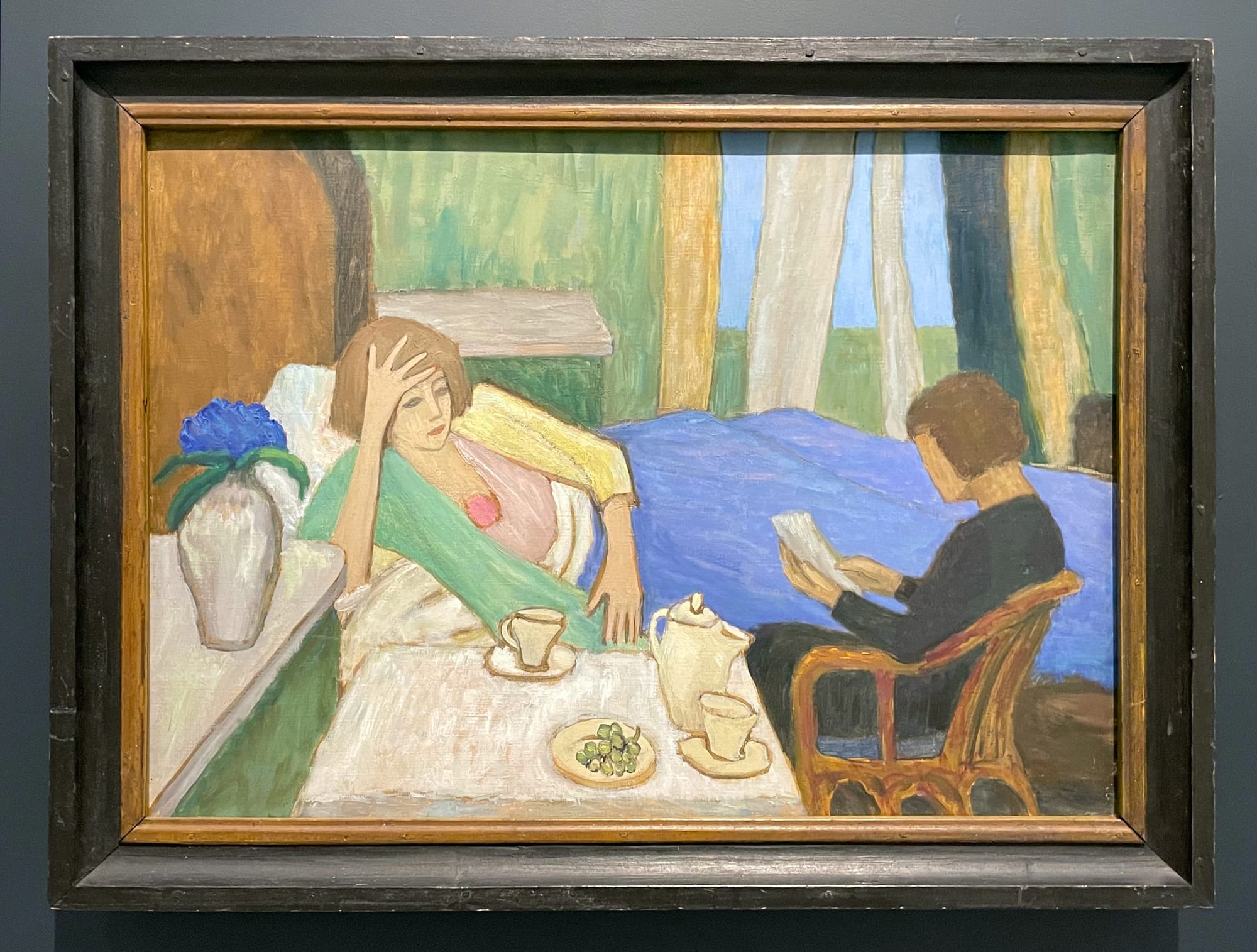 “The Letter” (1930) is among the show’s subtler works, rendered in soft floral hues, but it fuses photography’s time-based principles and painting’s image-based ones into an exceptionally elegant whole. The layered composition depicts a reading woman in a chair, turned away from us, adjacent to another woman lying in bed with her head propped up, facing us; behind them, we see a grass-green wall and white curtains moving with the breeze from an open window. The motion of nature and people, oceanic color, shifting focal points, and fluid brushwork cohere into a moment in time, soon past. It is a graceful testament to Münter’s brilliance, and an invitation into her world.