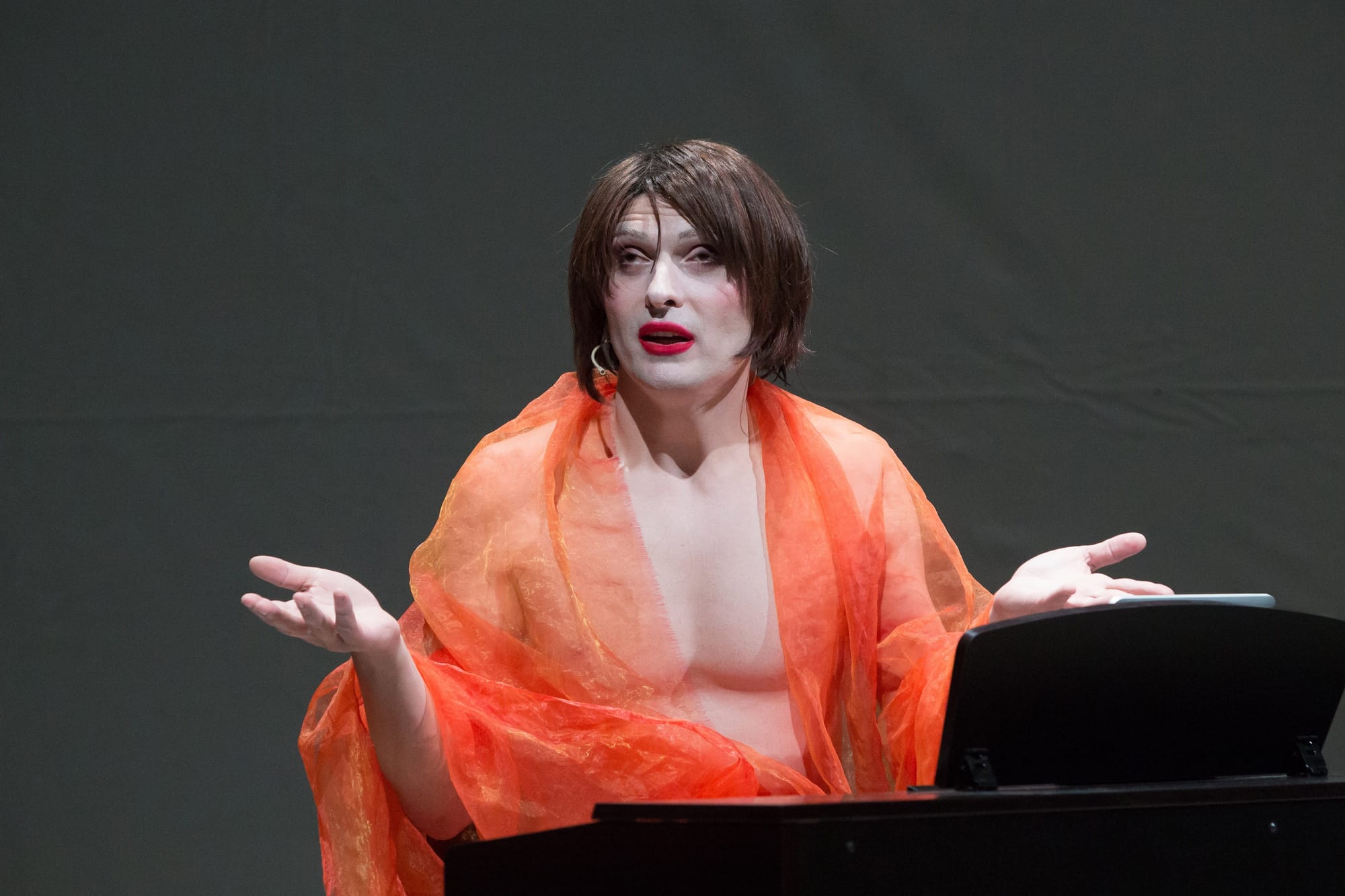 Dimchev sings both tenor and countertenor comfortably, laying on the vibrato as thick as his makeup. His performance recalls the gay piano bars of a bygone era, with someone tickling the ivories as volunteers warble show tunes. (His piano-playing is nimble enough, but I wasn’t tempted to buy the CD.) Though generally friendly, he didn’t hesitate to bark instructions to the writers and performers, and, like a cranky vocalist in a rundown club, complain about the defective sound system, all as part of his act.