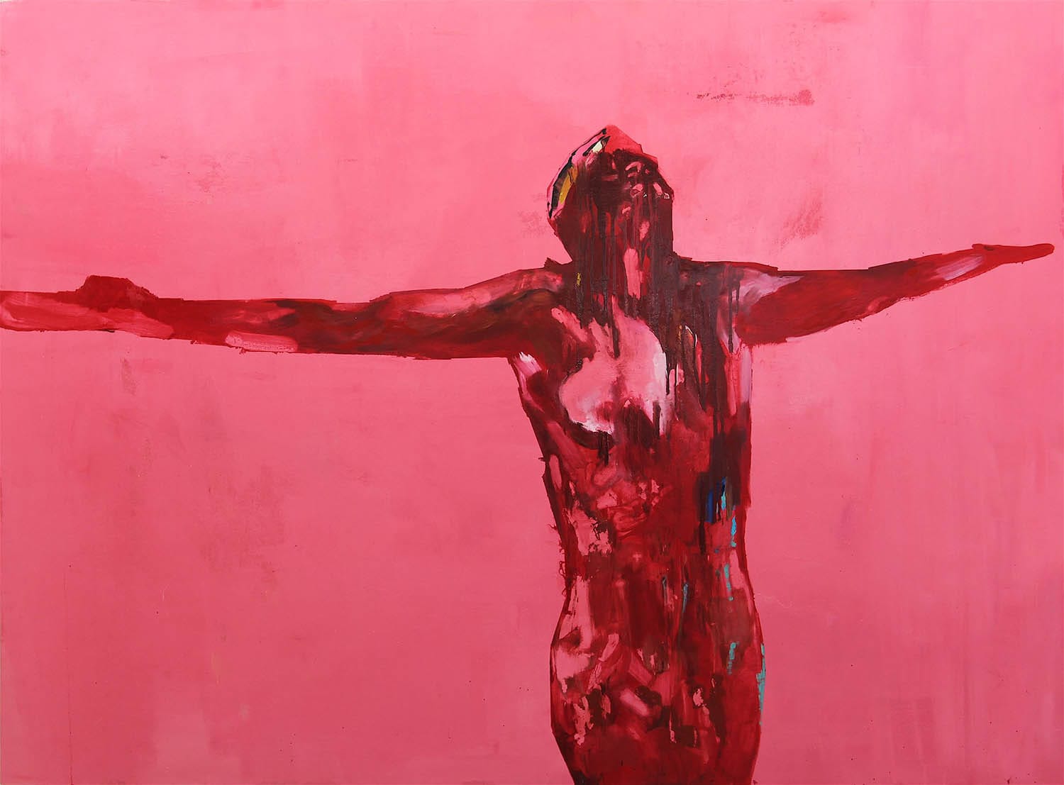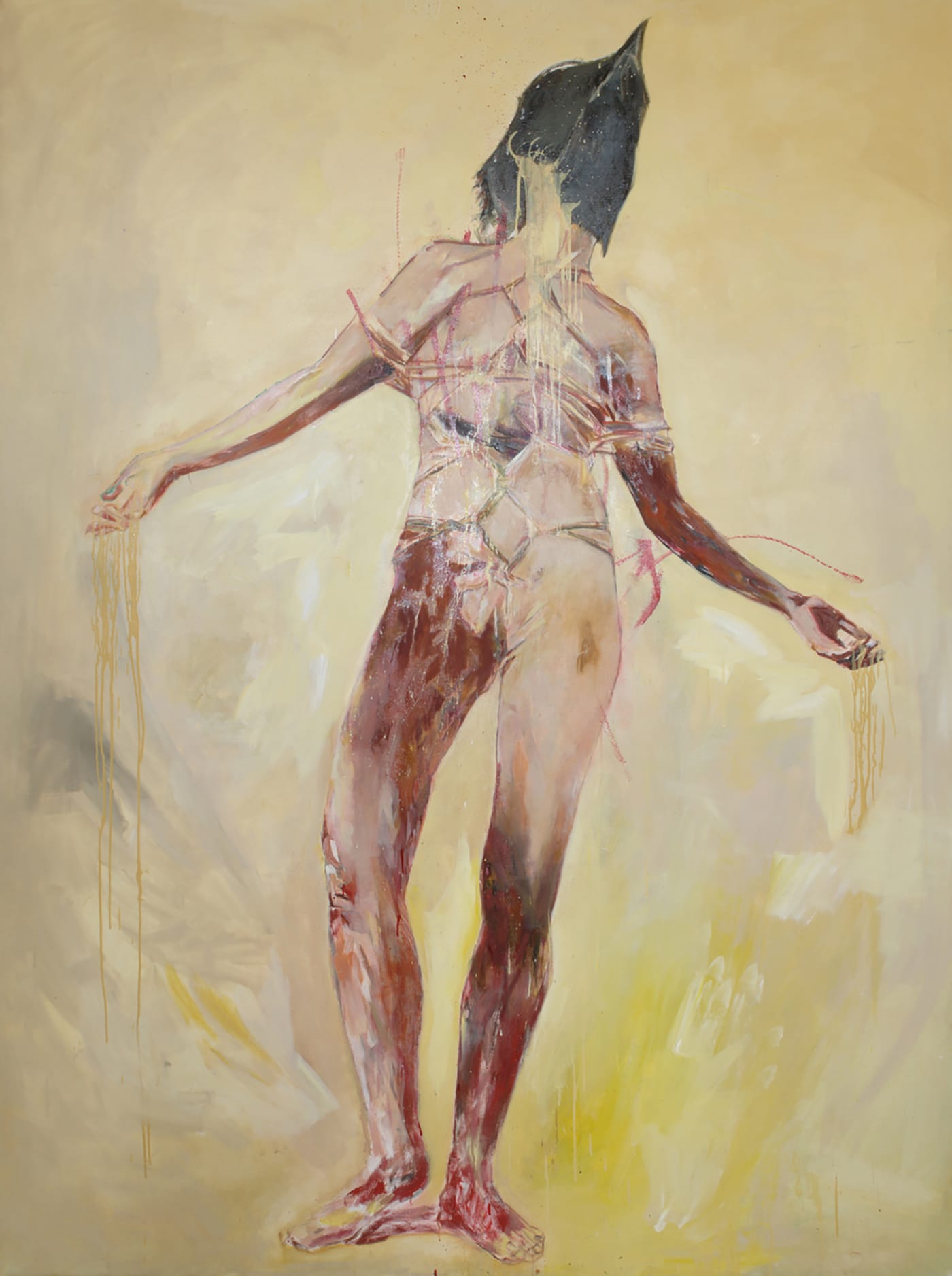 IA: I think that (up until recently) I had been avoiding painting women in pain. Socially, male pain, male anger monopolizes the field of sexuality and media studies. Moreover, as a nonwestern woman creating work about subjugation in a UK academic context, my only hope of the work being taken seriously was to position the figures as male or genderless. Considering the highly censored discourse on the torture at Abu Ghraib proved, in many ways, too psychosocially probing. I was already asking so much of the audience to look at these blown-up, hyper-stylized images of the “Other’’ in pain, and in their own visual language that I felt unable to tackle the gender politics of female pain in the same image.