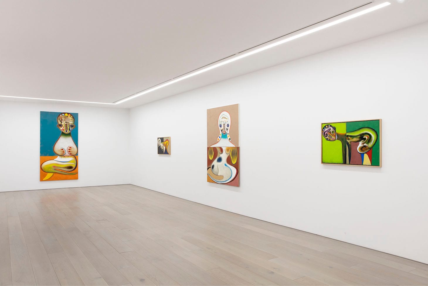 His paintings and works on paper are on two joined supports. The dual canvases, whose grounds are different colors, conjure two distinct worlds. The body exists in one physical realm, while the head is located in the other — or the head might be divided vertically. Each work is always a creature made up of separate but joined parts, like a plastic model that needs to be assembled.