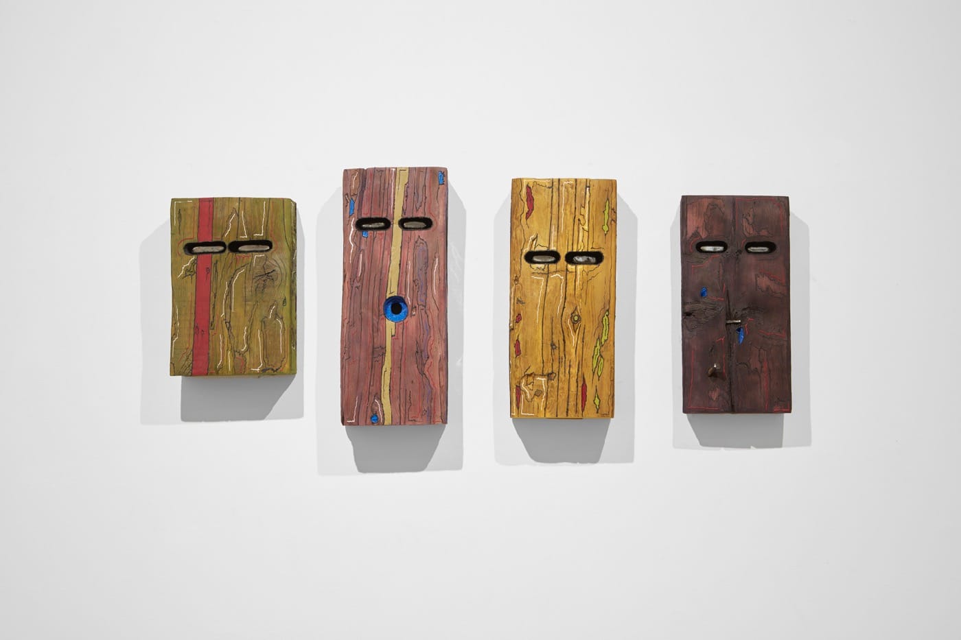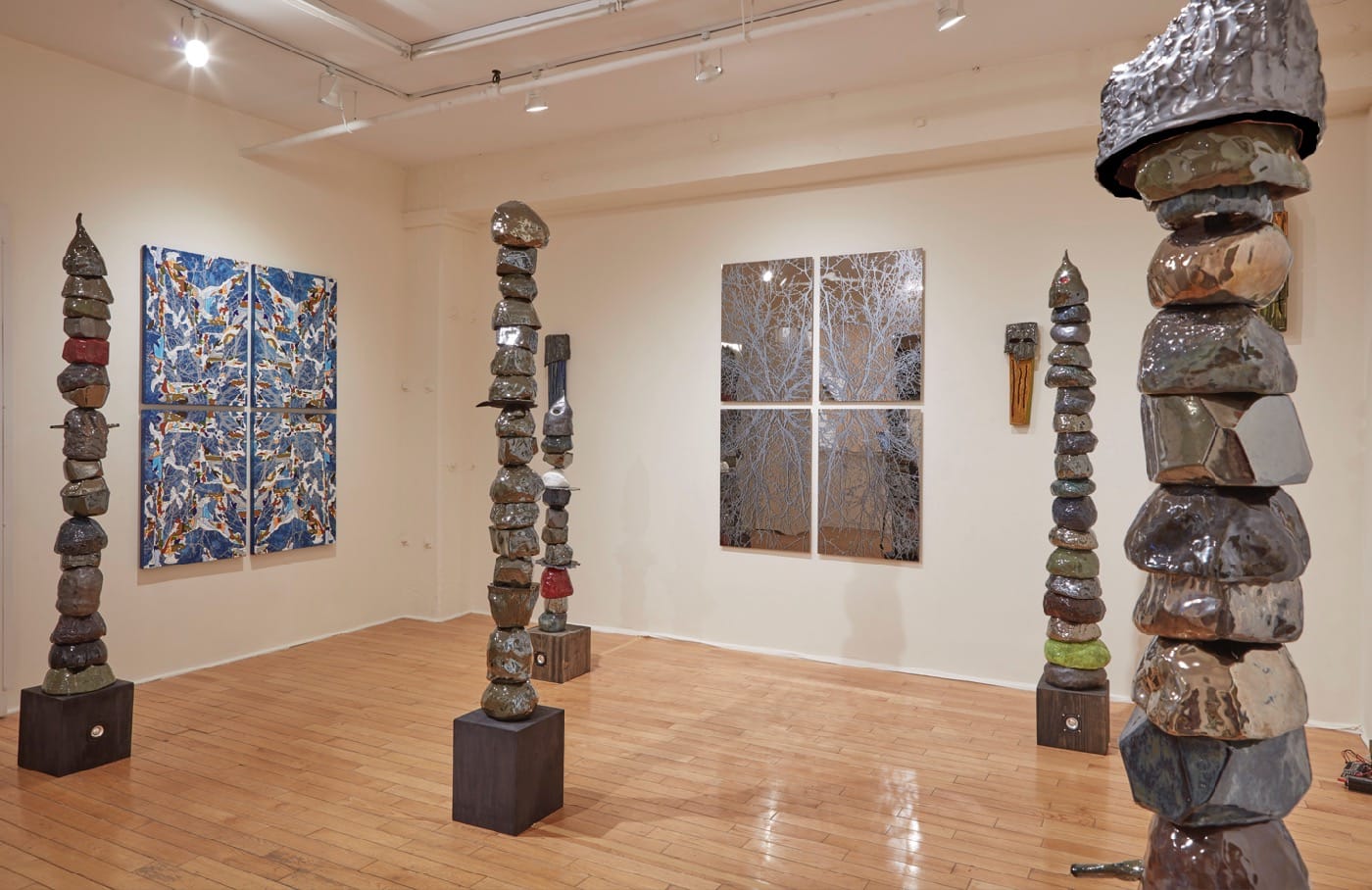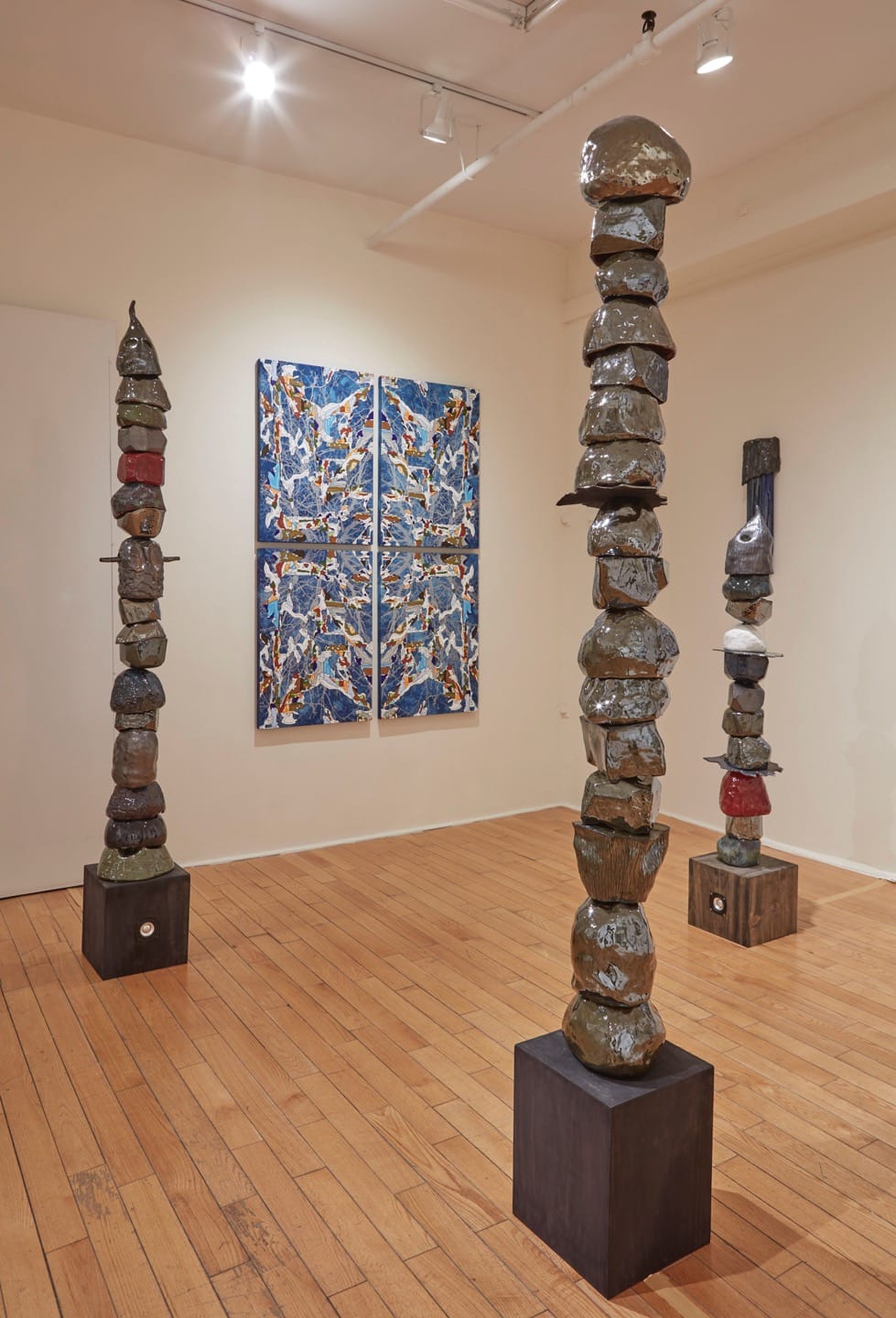 In this enchanted forest there are metallic-glazed ceramic cairns vertically stacked so they too look like guardians of this liminal realm. The music that wafts through the space also comes from the wooden speakers on which they rest. I confront a version of myself in a mirror piece that is imprinted with multifarious branches like the respiratory tracks of a human lung. There is painting too, such as “Mosaic Diptych” (2018), which has shadowy branches in the background, with jagged, raucously colored strips layered on top. I wandered into this fey place because of the simultaneously futuristic, yet primeval objects, but the music furtive and mesmerizing made me stay.