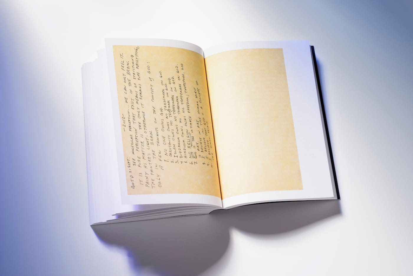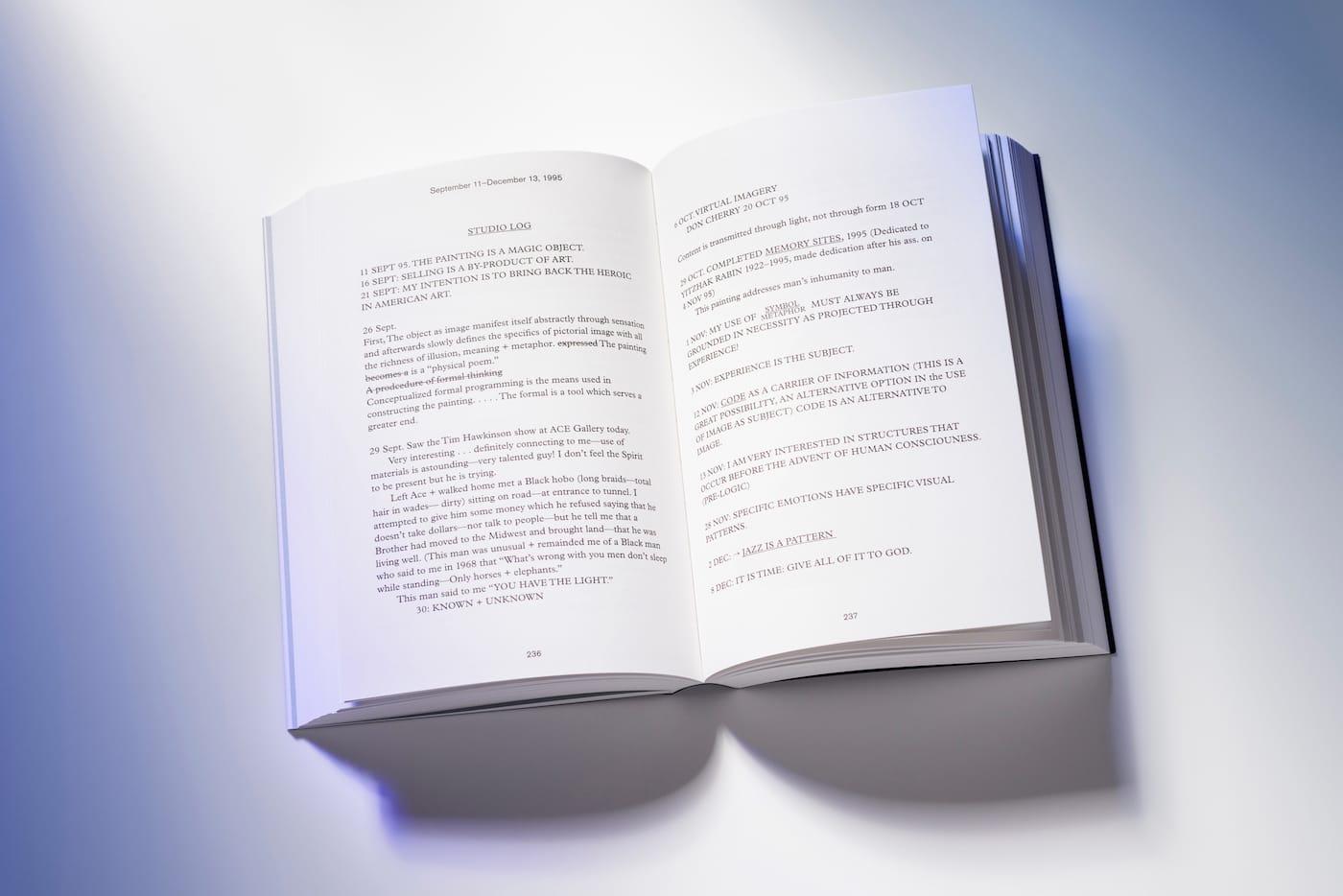 Whitten used lists throughout his journals to track his progress and goals. In his 1998 studio log, reproduced on the back cover of the book as well as inside, Whitten expressed his aversion to the ego-driven pursuit of art stardom in a list of 32 objectives, which include: