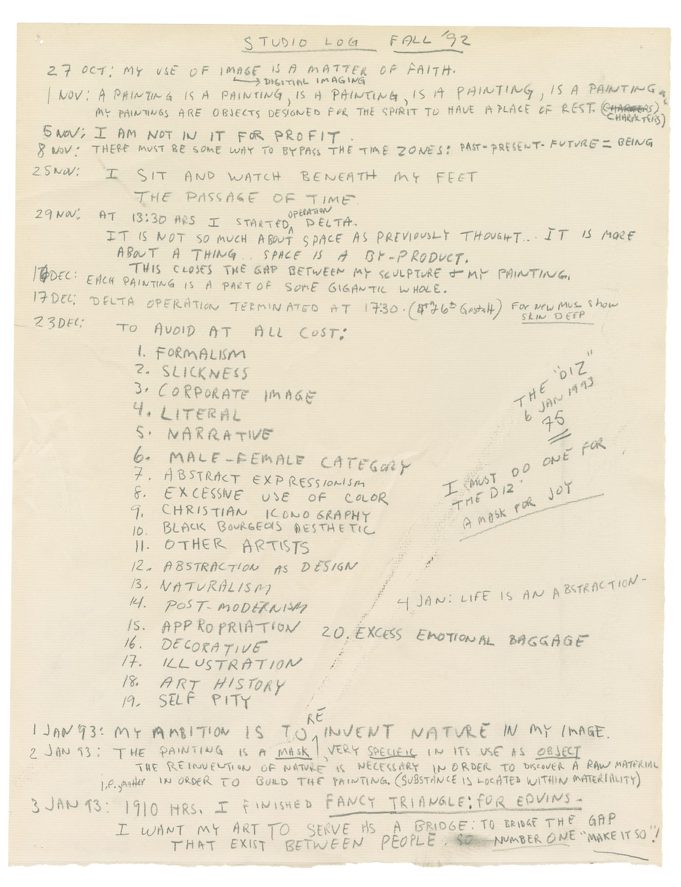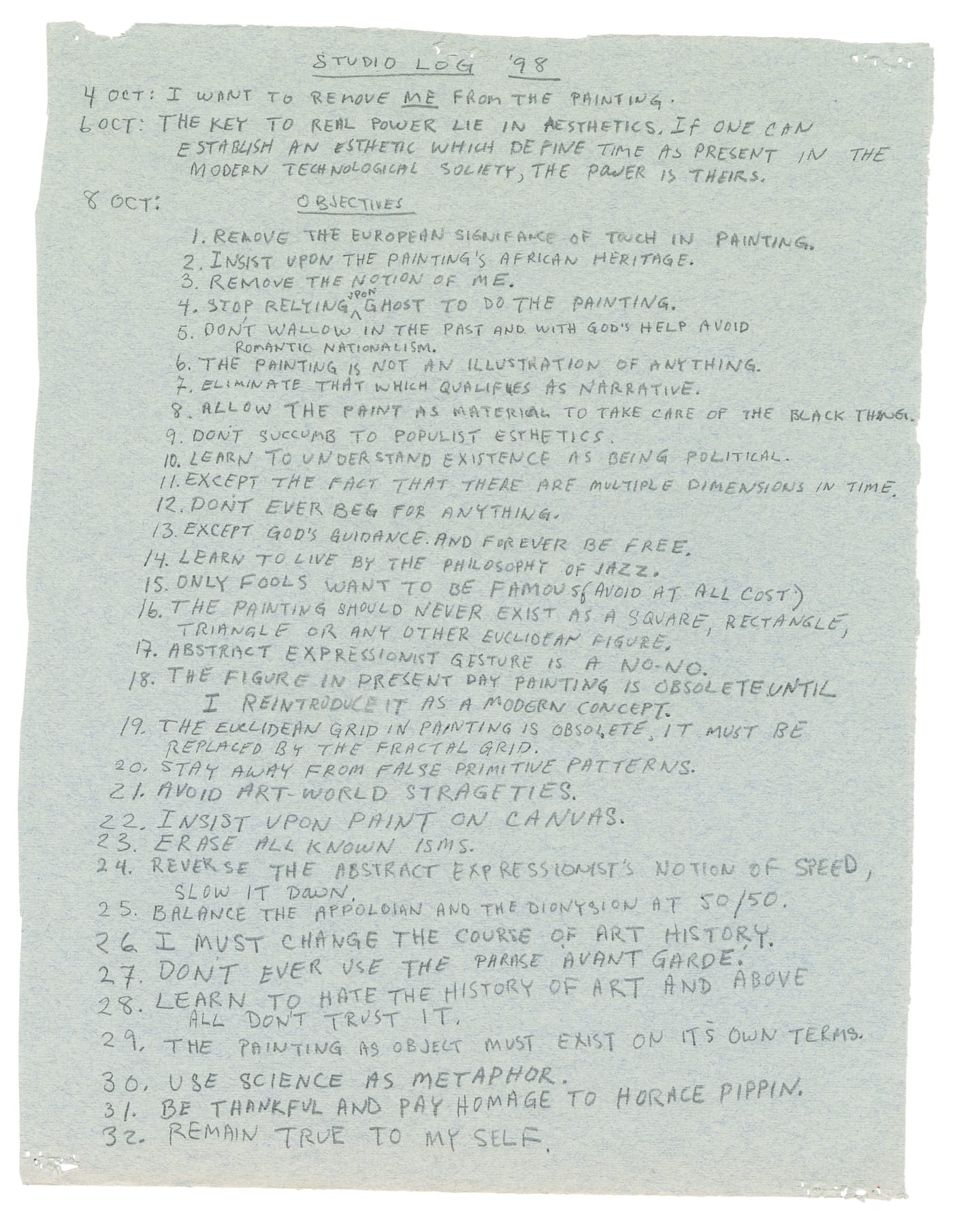 Throughout his notes, he struggles to define his style, experimenting variously with calling himself an Abstract Photo-Realist, an anti-Cubist painter, or a Digital Expressionist. “I must stop trying to name what I am doing,” he writes in a 1974 entry. Genre categorizations all fell in the shadow of Western art history, which he included in his 1992 list of 20 things “to avoid at all costs”—in addition to formalism, abstract expressionism, and “black bourgeois aesthetic”. In April 1975, he wrote, “May the history of Western painting die within me”.