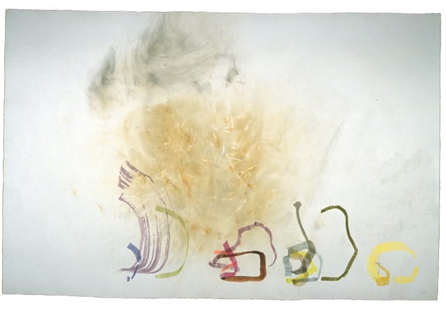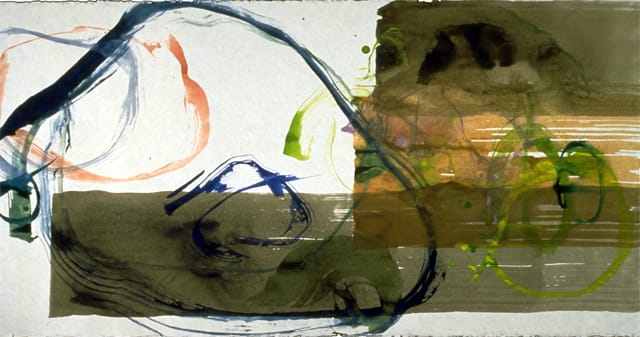 Cage’s methods and temperament contrast drastically with Pollock’s heroic, rather macho commitment to inner disorder and overall composition. Cage’s first painting workshop was organized in the spring of 1988 as a result of a brief experimentation with watercolors during a visit to the Mountain Lake Workshop in 1983. There, master printer Ray Kass presented Cage with a system to make work, including a studio prepared with sixty rocks collected from a nearby river, a selection of brushes arranged according to type and size, a selection of different papers, and a palette of paints. Consulting the I-Ching, Cage began to compose his first works, letting chance choose the paper, determine placement of the rocks, and decide what brush he would use to trace them.