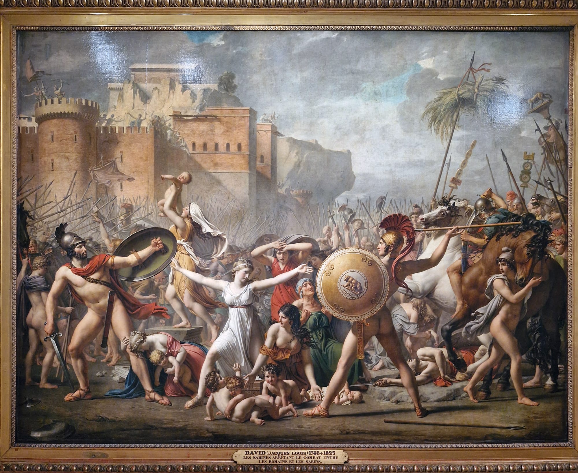 As well as flawless visual analysis, the show is a triumph of loan power: The press release notes that 100 objects from around the world accompany the Louvre’s unparalleled collection of large-scale paintings. Along with key pieces such as “Napoleon Crossing the Alps" from Reuiel-Malmaisson (1800), “Mars Disarmed by Venus and the Graces” (1824) from Brussels, and “Death of Socrates” (1787) from The Met, we have many notable duplicates, which almost feels like showing off. Indeed, we see two versions of David’s 1812 portrait of Napoleon (from the National Gallery of Art, Washington, and from Fontainebleau) and the original “Death of Marat” from Brussels — mounted here in total darkness upon a dais in a concave niche — as well as copies from Versailles and the Louvre’s own collection facing it in a triumvirate. There was no need to include Ingres’s monumental 1812 “Romulus, Conqueror of Acron” from the Beaux-Arts in Paris as a counterpart to his “Intervention of the Sabine Women” of 1799, but here we are. An embarrassment of riches.