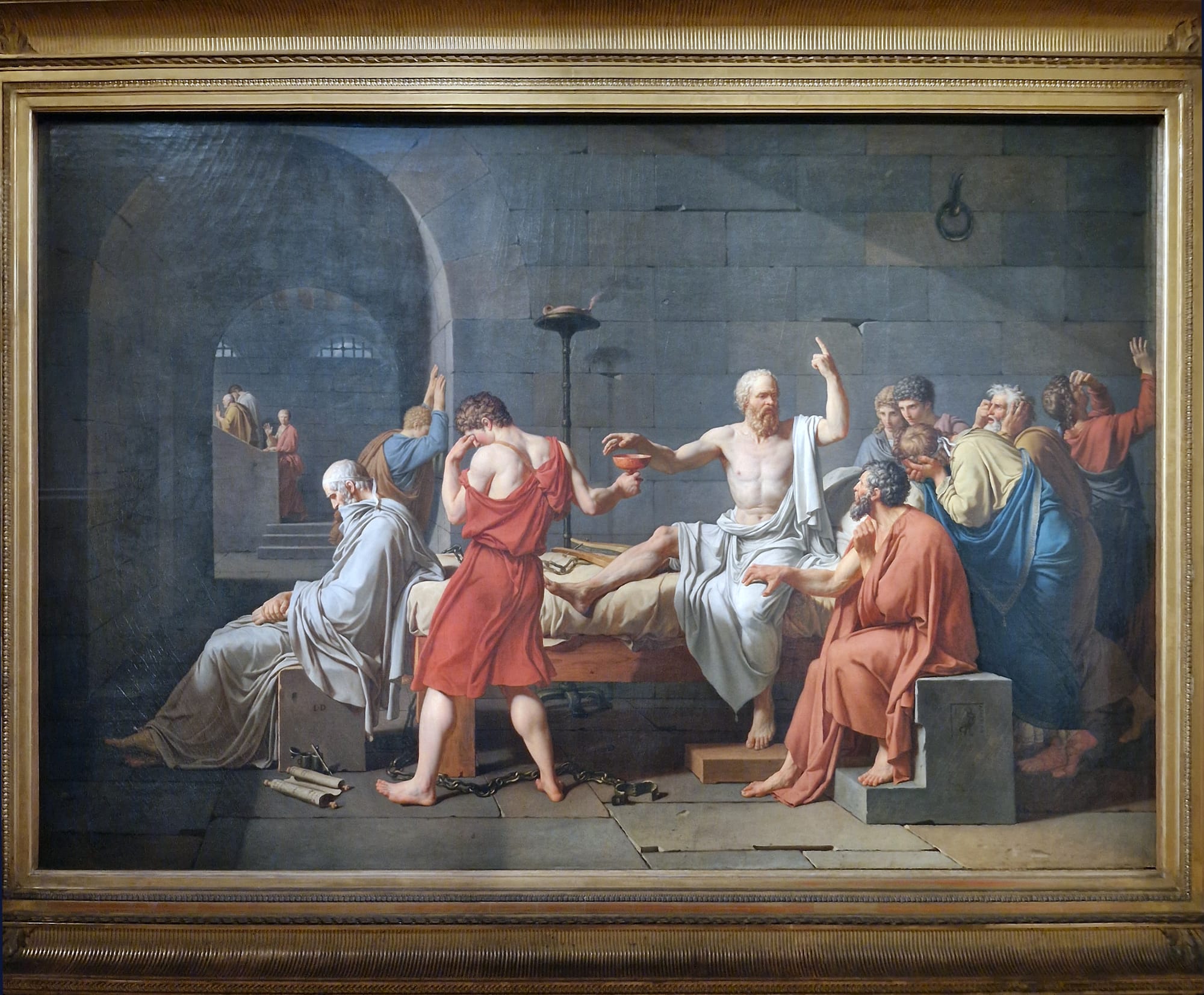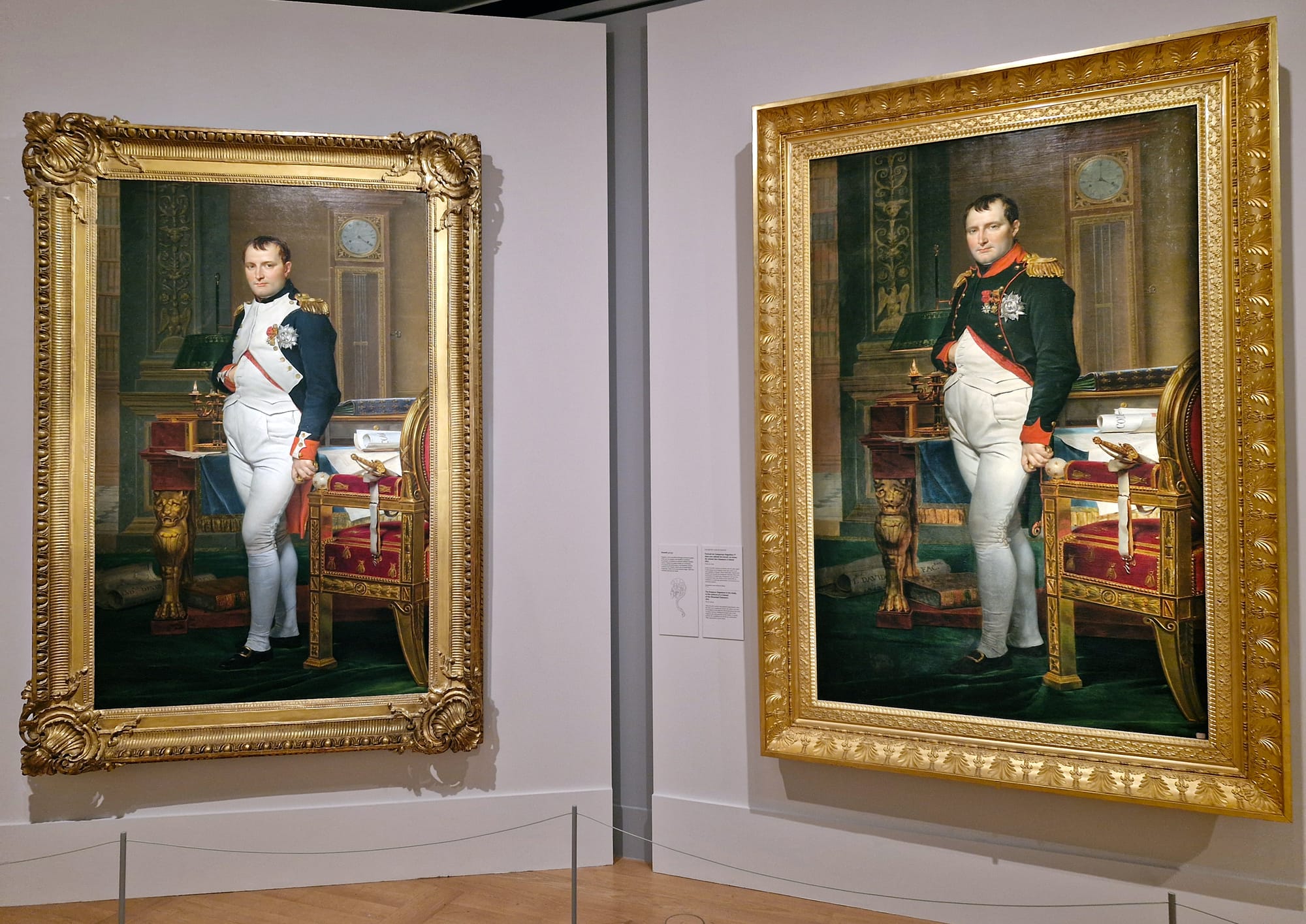 As well as flawless visual analysis, the show is a triumph of loan power: The press release notes that 100 objects from around the world accompany the Louvre’s unparalleled collection of large-scale paintings. Along with key pieces such as “Napoleon Crossing the Alps" from Reuiel-Malmaisson (1800), “Mars Disarmed by Venus and the Graces” (1824) from Brussels, and “Death of Socrates” (1787) from The Met, we have many notable duplicates, which almost feels like showing off. Indeed, we see two versions of David’s 1812 portrait of Napoleon (from the National Gallery of Art, Washington, and from Fontainebleau) and the original “Death of Marat” from Brussels — mounted here in total darkness upon a dais in a concave niche — as well as copies from Versailles and the Louvre’s own collection facing it in a triumvirate. There was no need to include Ingres’s monumental 1812 “Romulus, Conqueror of Acron” from the Beaux-Arts in Paris as a counterpart to his “Intervention of the Sabine Women” of 1799, but here we are. An embarrassment of riches.