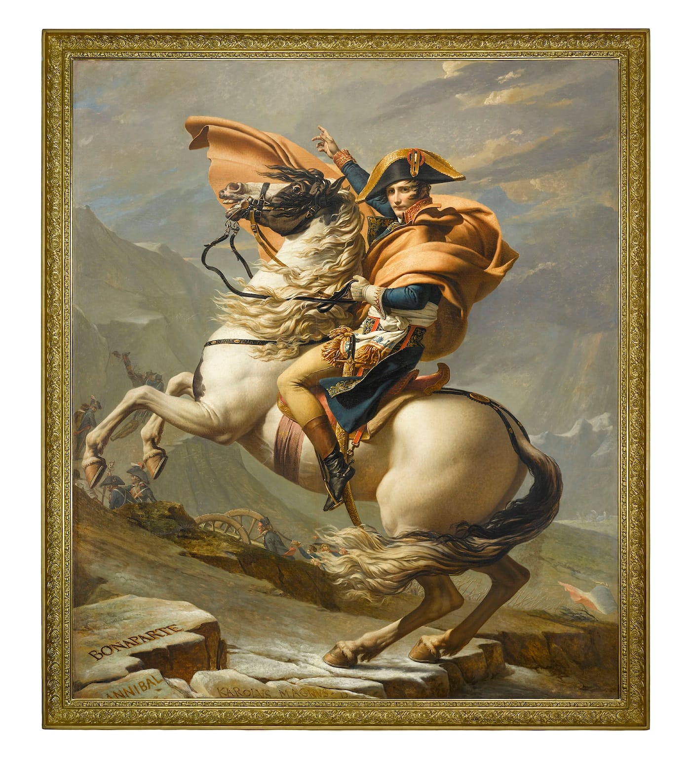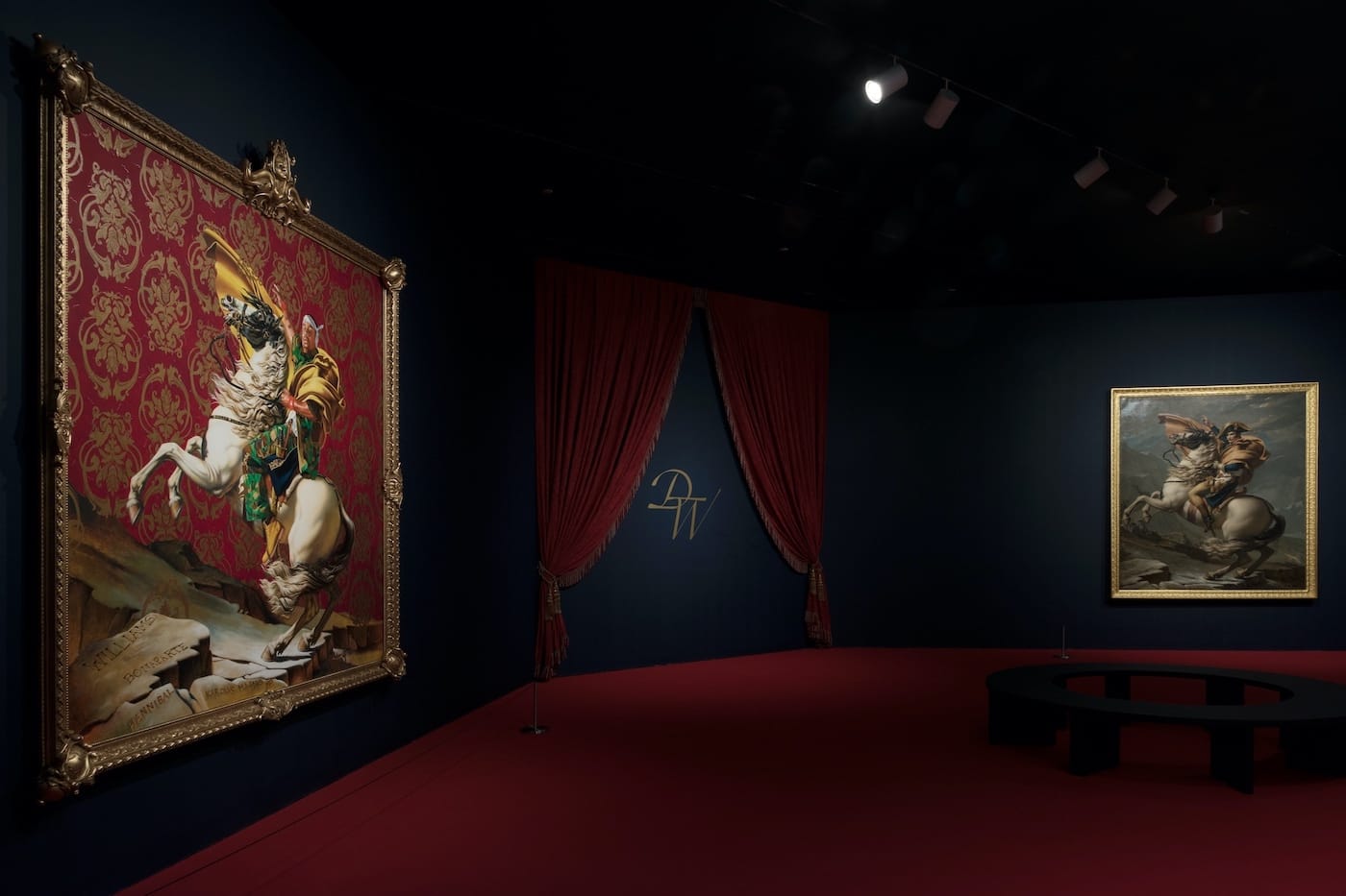 On the right is Jacques-Louis David’s “Bonaparte Crossing the Alps” (1800–01). And on the left, Kehinde Wiley’s “Napoleon Leading the Army over the Alps” (2005), his appropriation of that picture. His painting is slightly bigger and has a somewhat more elaborate frame.