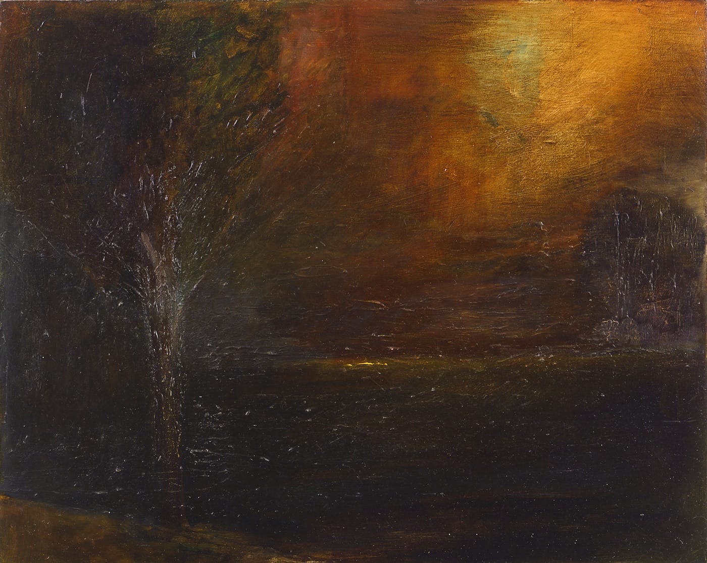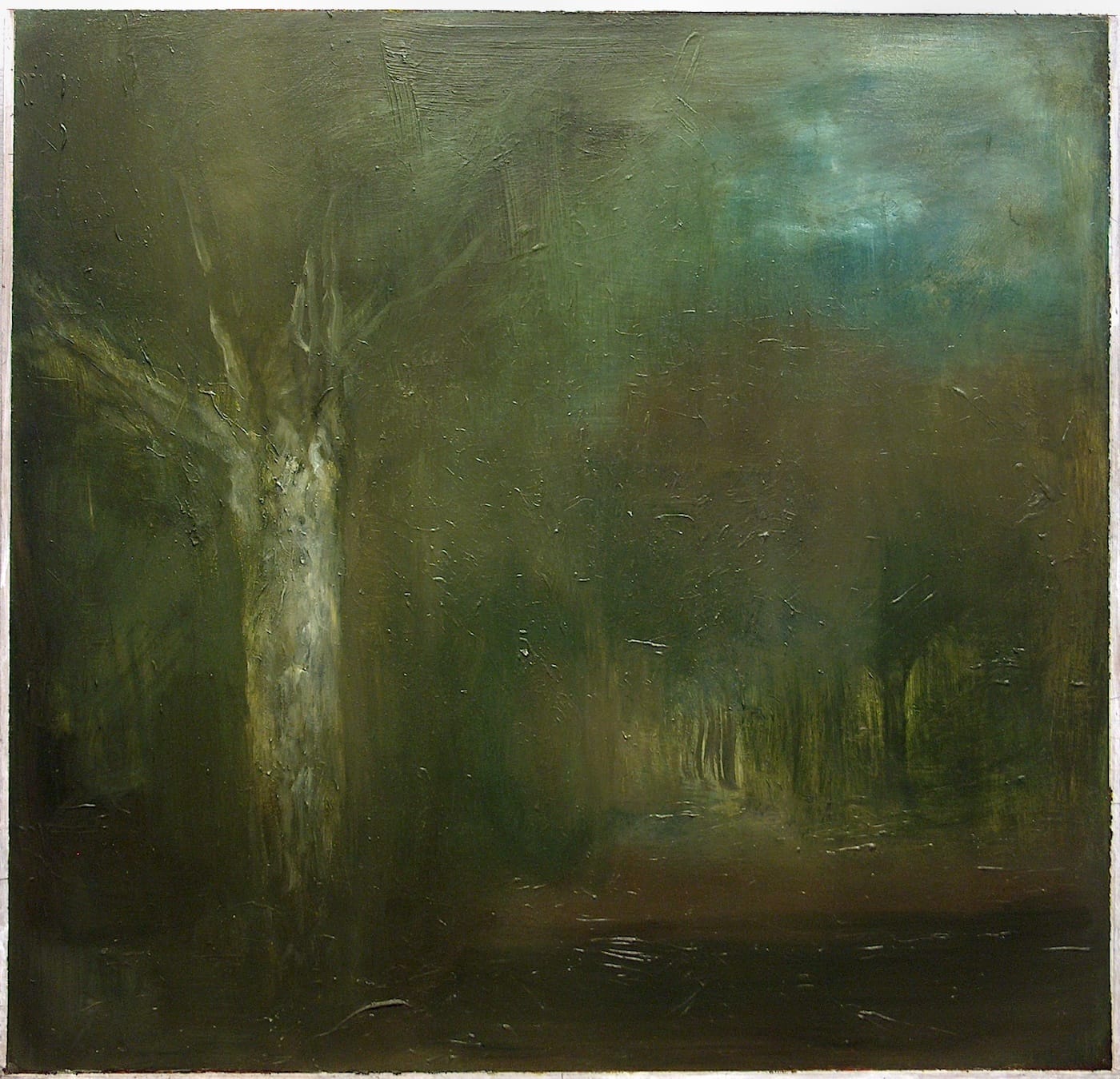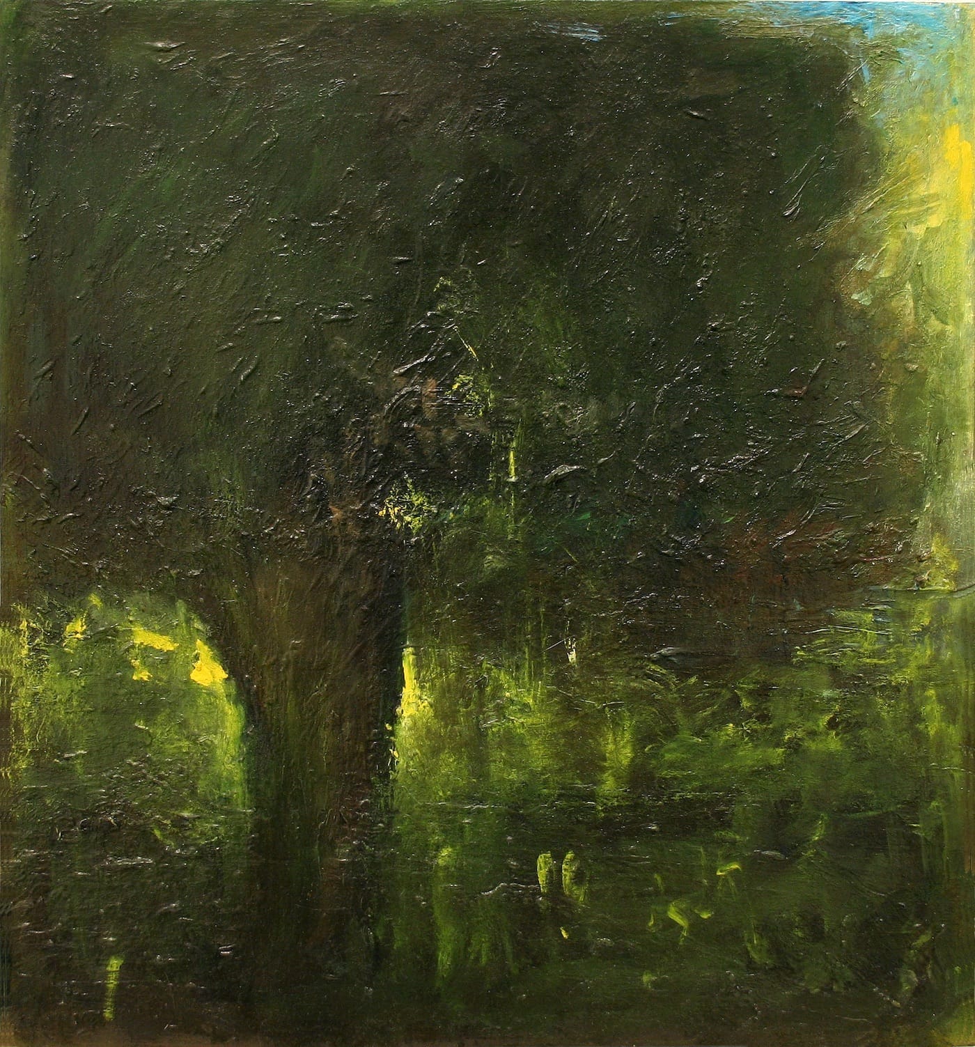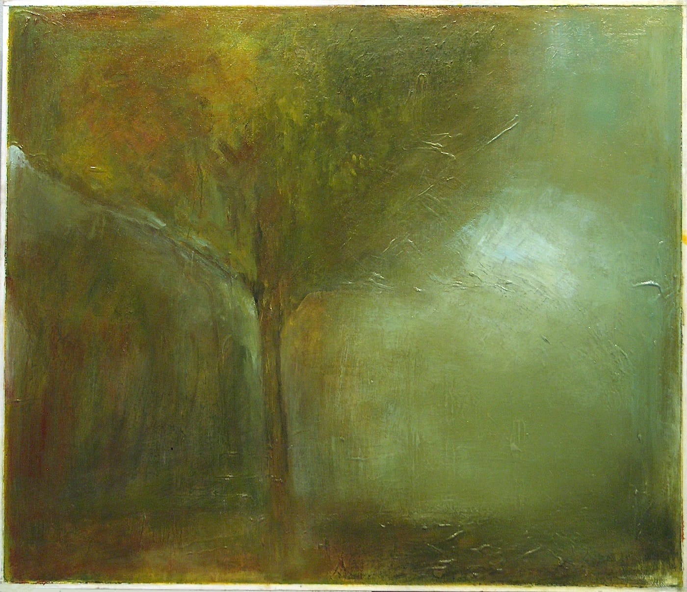 “Early Morning” (1998) is a small painting with some golden light on the left, and “Moonlight on Winter Field” (1998), another small painting, shows trees in the distance and snow in the foreground. Compare then, if you will, “Summer” (1997-2002), with its mass of green surrounding the tree at the bottom and glimpse of blue sky breaking through the upper right-hand corner, with “After Rain” (2000), in which a bit of sunlight seeps through on the right.