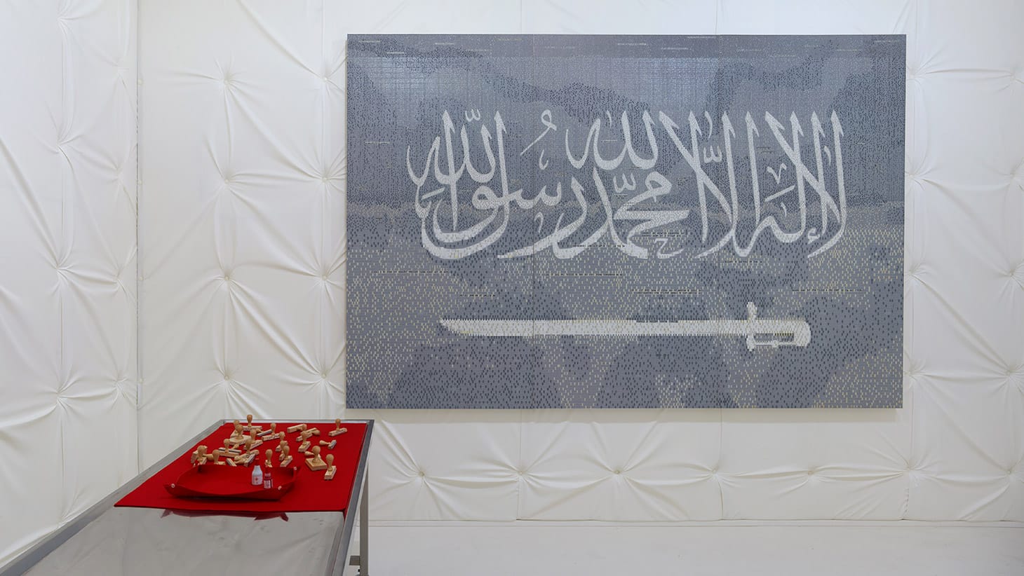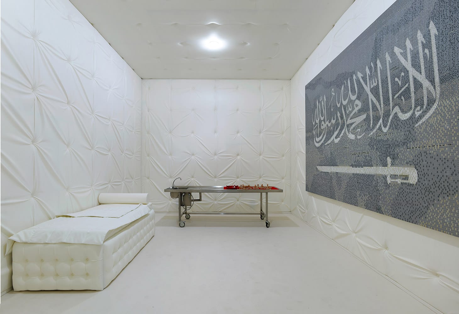At Art Basel Unlimited, Gharem’s constructed exterior resembles the exterior of the Saudi consulate, complete with the yellow awning above the entrance. Entering it, one is immediately confronted with an imagined space that resembles a psychiatric ward, padded white walls and a surgical table complete with a sink and a large canvas of the Saudi Arabian flag.