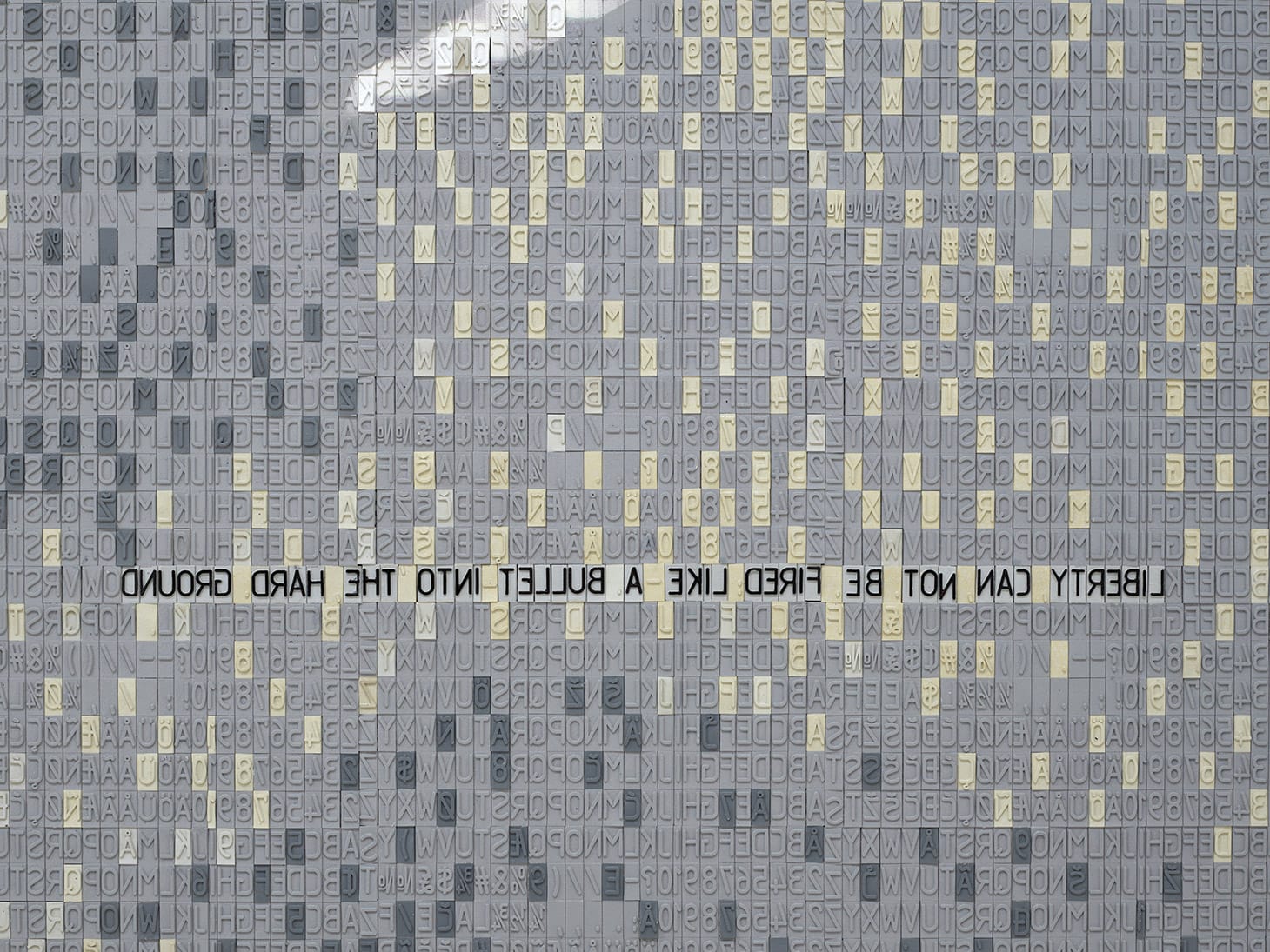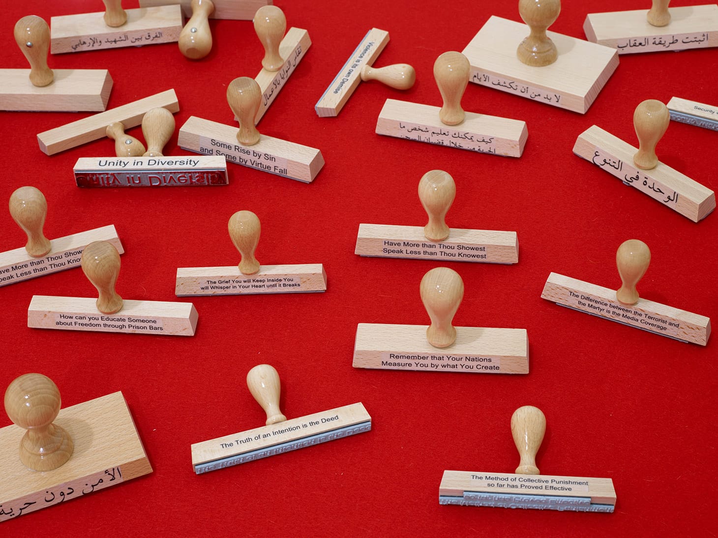 Visitors entering the installation can stamp the walls with one of several politically charged phrases in English and Arabic. One reads: “Violence is its own demise.” Another reads: “The difference between the terrorist and the martyr is the media coverage.”