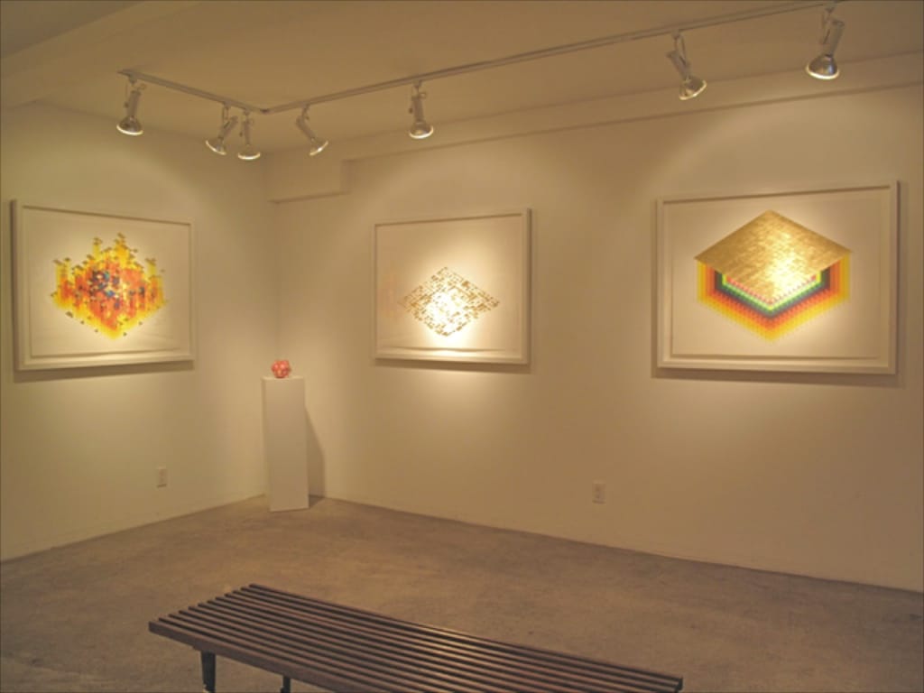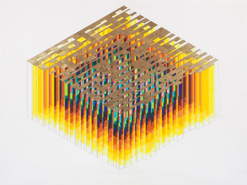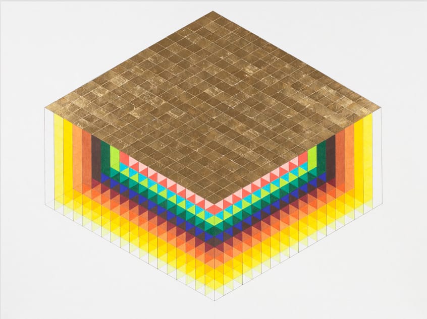 All I know is the R in “Golden Parachutes, 8xRx9” corresponds to fluctuating numbers, numbers that cause the golden top layer of correlated cubes to undulate as a result. A symphony of numerical gradations create tension between order and chaos as the gradual layering from edge to center moves from yellow dispersion to dense neon friction. The atmosphere created is like that of a weather map signaling an oncoming thunderstorm.