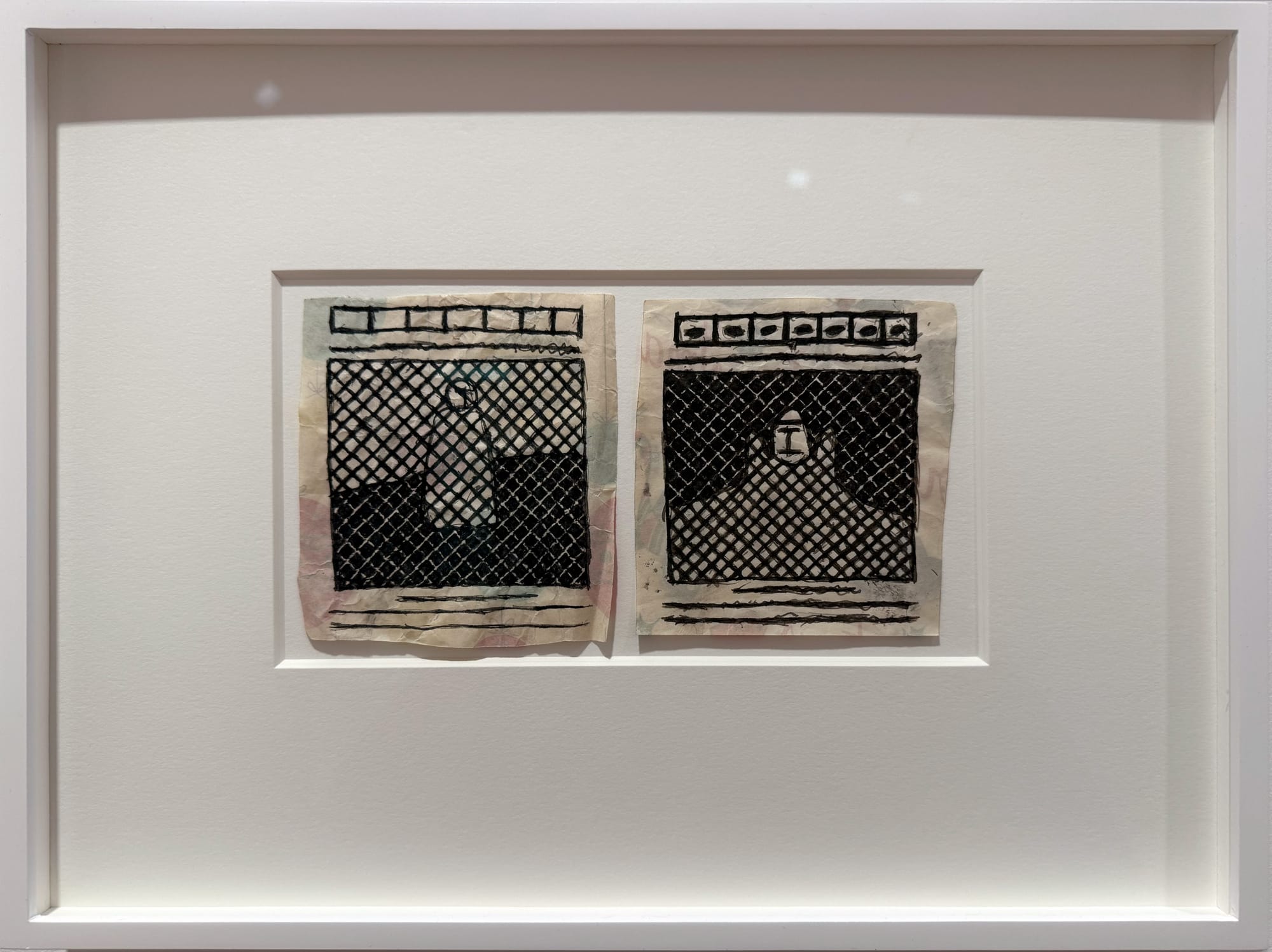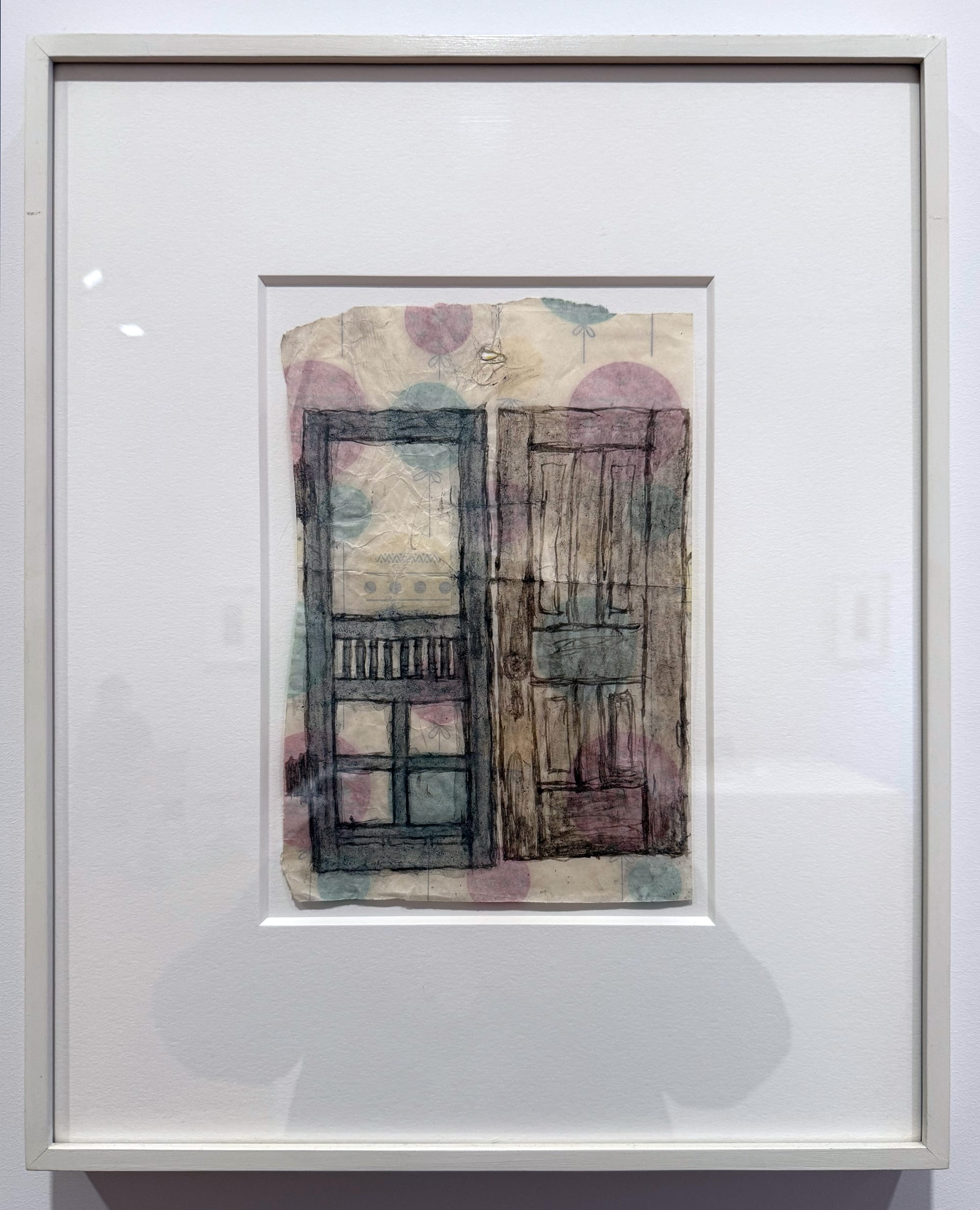 Indeed, we talk often about the transportive power of art, but these feel literally, almost metaphysically, so — as if we’re entering a universe bound by a different set of rules that it’s a pleasure to explore. “Untitled (Door)” (undated), rendered on what looks like balloon-dotted wrapping paper, depicts a pair of disembodied doors, set against no edifice except for the picture plane itself. Meanwhile, “Untitled (Diptych)” (undated) uses that same paper as the backdrop of a peculiar, yin yang-like work in which robed figures stand at different distances behind a chain link fence. Who is that at the door?