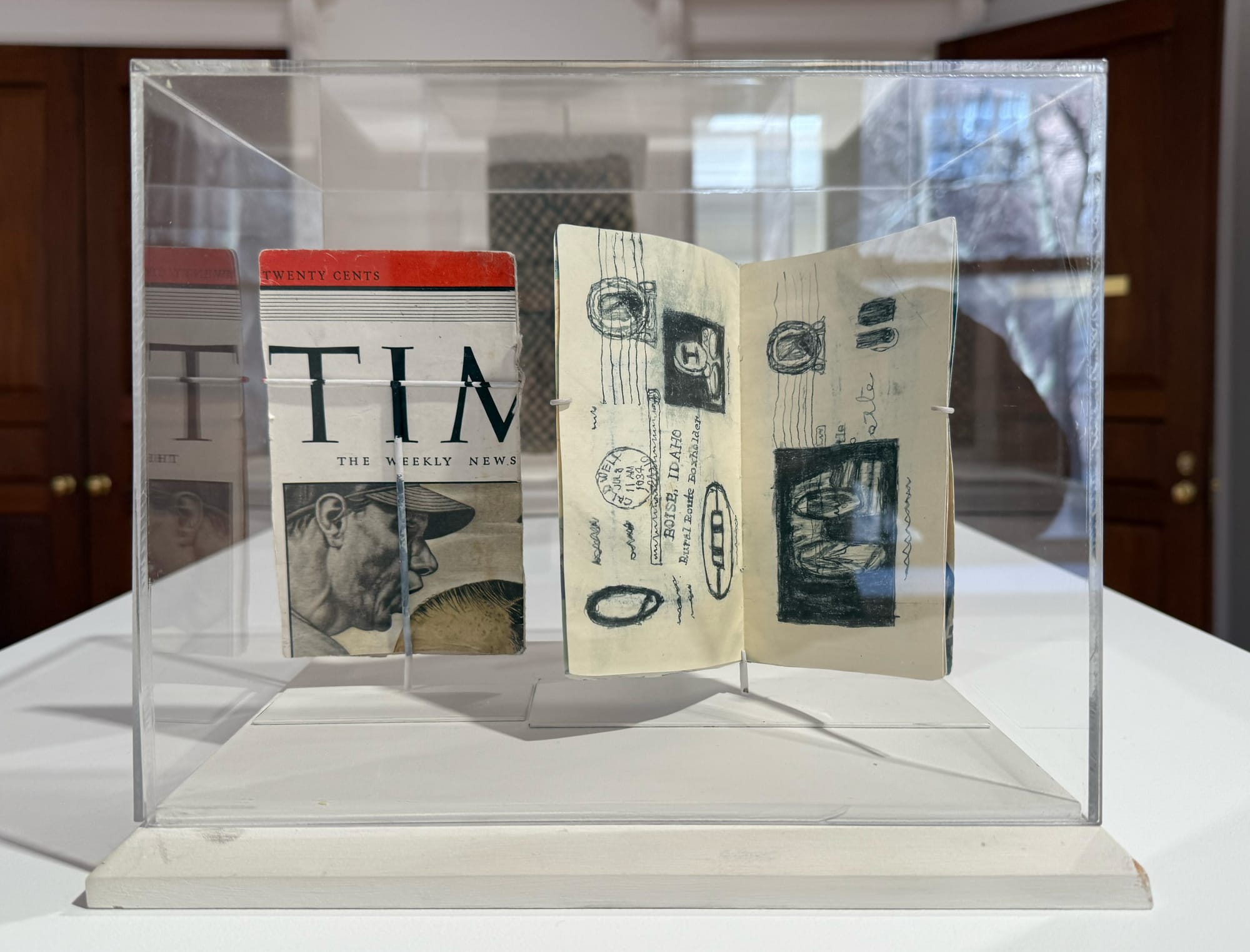 One of my favorite pieces in this exhibition is “Untitled (Time Magazine Book)” (1933–40). In it, Castle creates a postcard of sorts, complete with hand-drawn stamps — a testament to how far the imagination can travel.