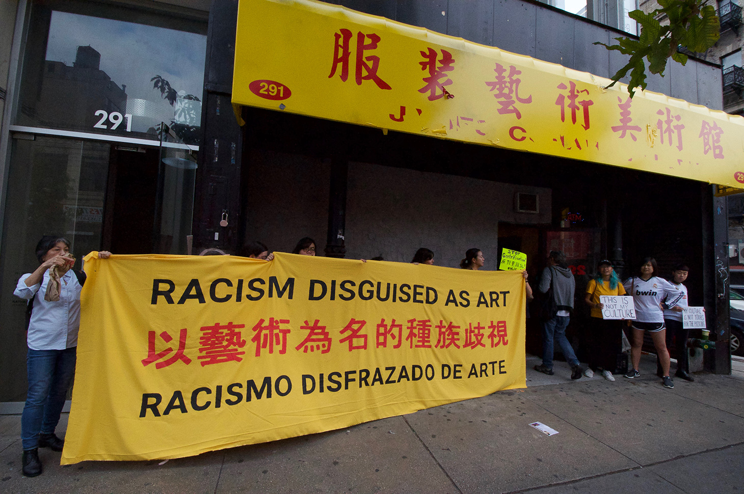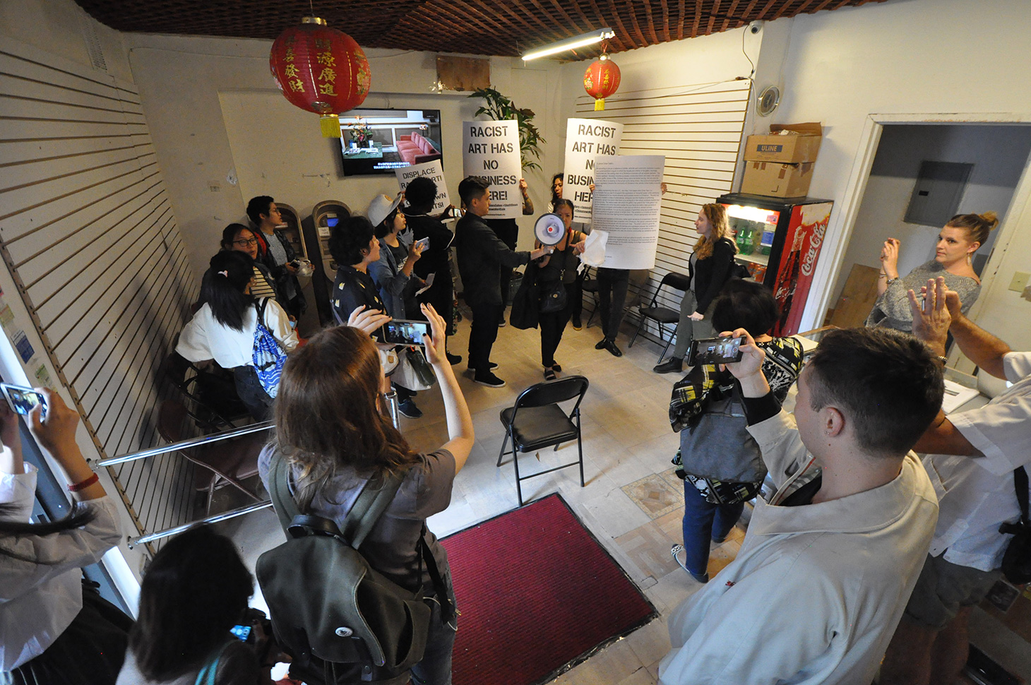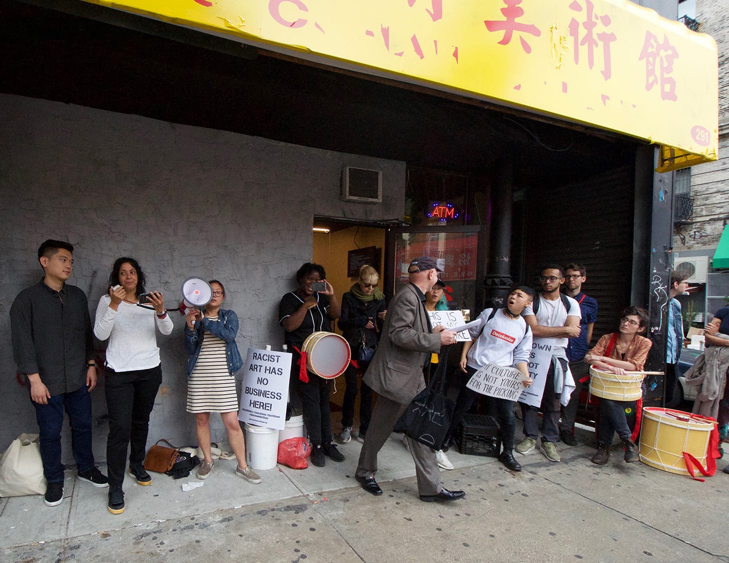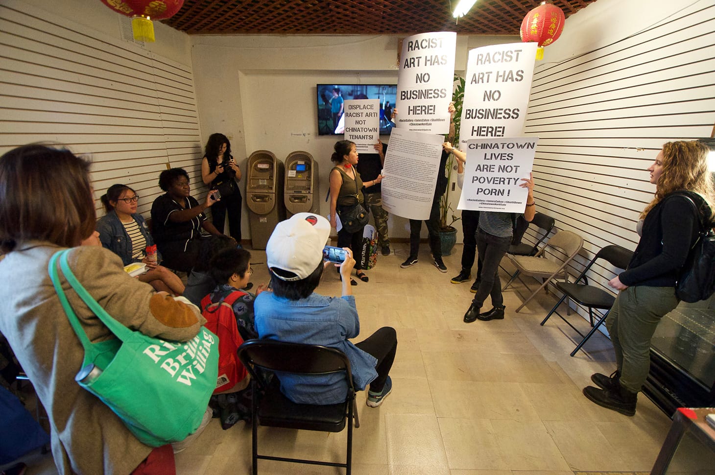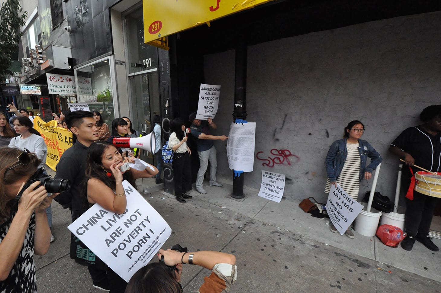 Dozens of people interrupted James Cohan Gallery's Sunday hours to demand that the gallery and artist take down what the protesters see as "racist aggression towards the community of Chinatown."