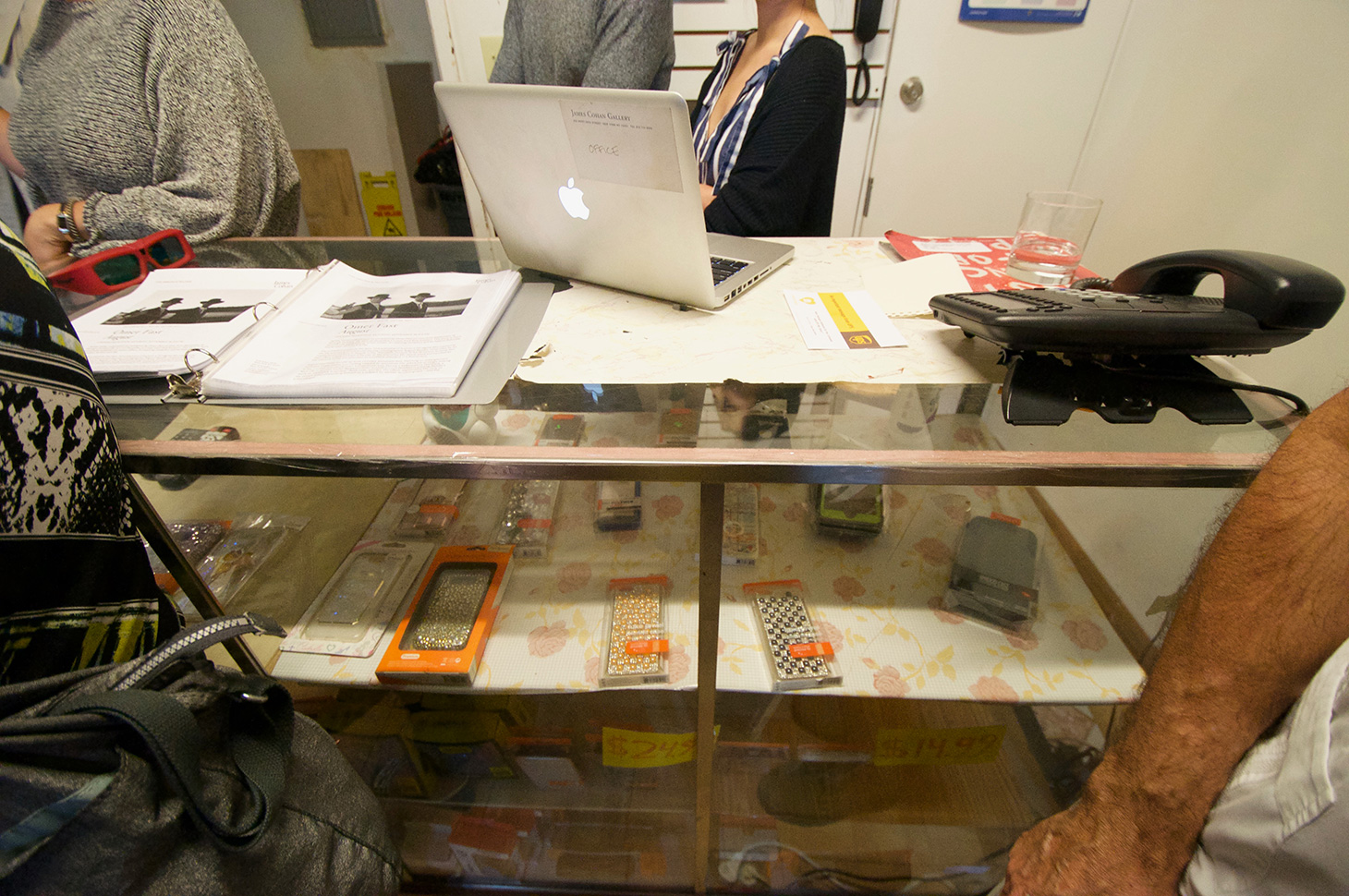 Protesters started their action at roughly 3pm EST in the gallery’s front room that included a broken air conditioner, folding chairs, a half-filled soda refrigerator, Chinese paper lanterns, vinyl tiles, a glass display case with cheap phone cases, two dirty-looking AtMs, cardboard boxes, and other objects that convey a sense of the space being a run-down Chinese-owned business.