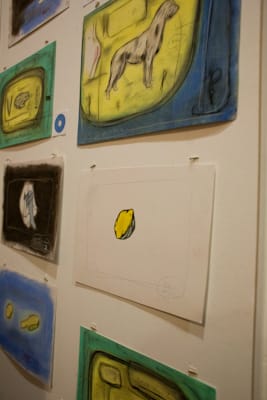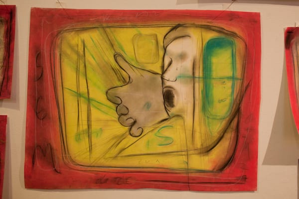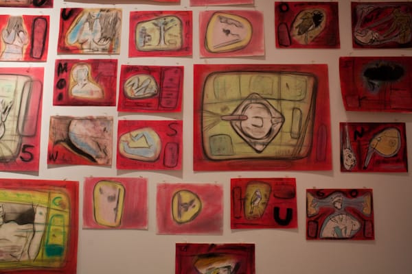 The color that dominates most of the drawings at Microscope is red, so the works are simply referred to as Reds, while a parallel series, Blues, hangs on an adjacent wall. The artist works mainly in charcoal. His subject matter includes personal objects, parts of the body, personal symbols from his youth, memories and dreams. The drawings feel cinematic, maybe even hypnotic. His reds feel inviting, and despite many drawings being personal, I didn’t feel “excluded” or pushed away as a viewer, to the contrary, I felt very welcomed into his graphic world.