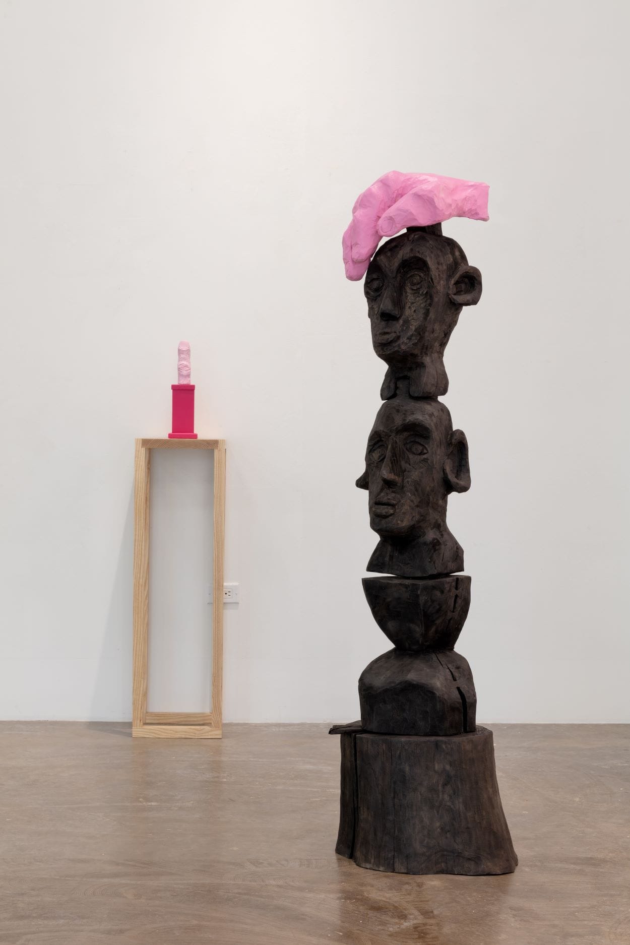 The same uncomfortable shade of pink coats the sexless pair of legs and feet in “Kneel” (2020), which bow blindly without the distinction of a torso or head. In all of these works, Gilbert makes no attempt to hide the joints and cracks in his wood. There’s a subtle sense of futility implied by this lack of polish, but also a bid for connection: Gilbert’s rough edges remind viewers to consider the maker, the time he’s spent, and the reasons he works the way he does. As with the ubiquitous, undefined face, questions are raised. But as the exhibition’s title suggests, a collective not knowing may be the answer.