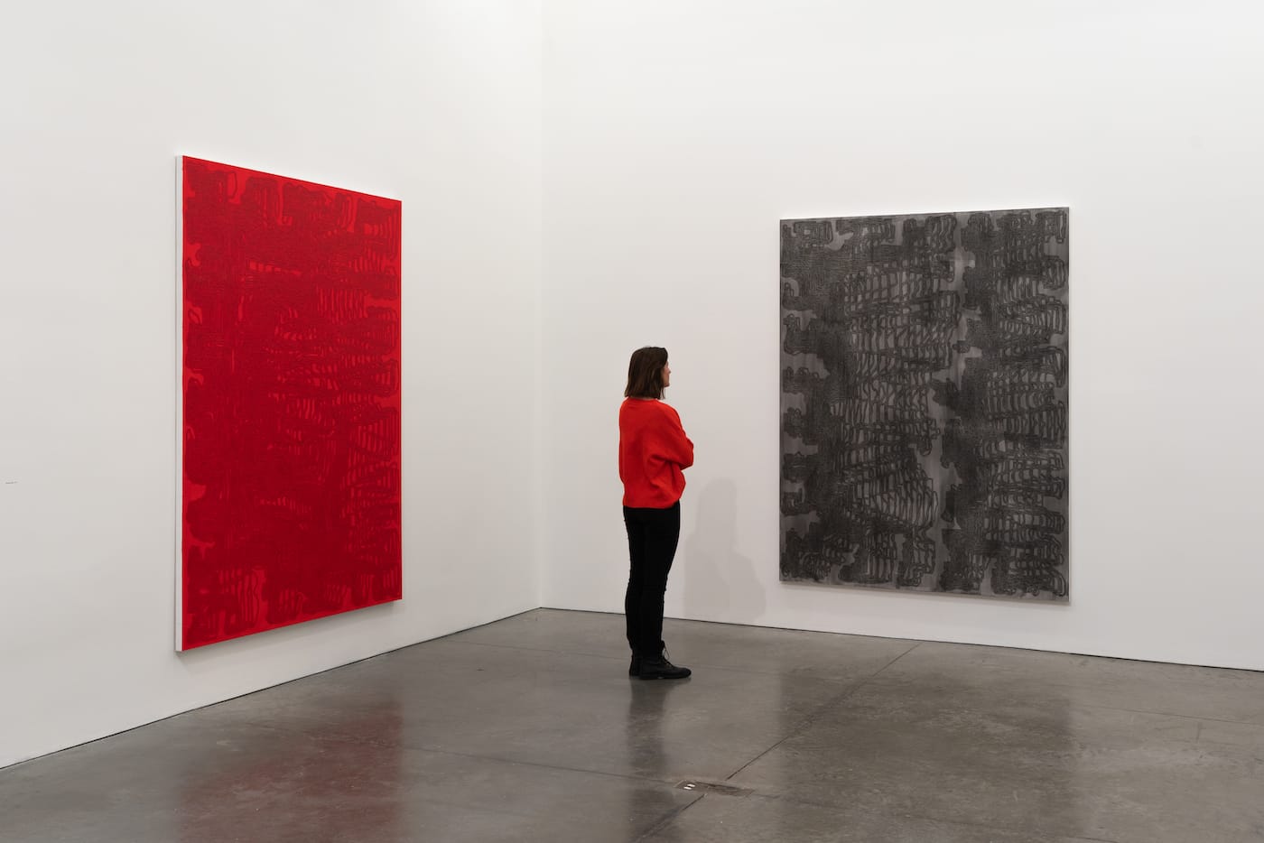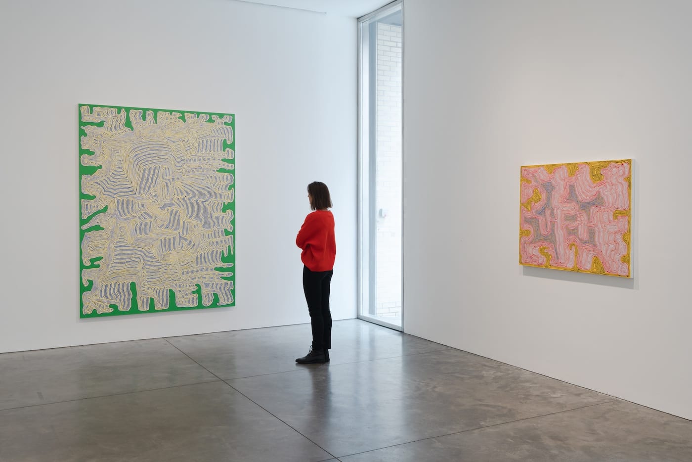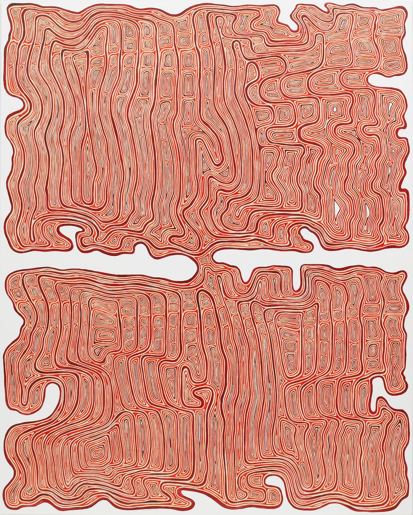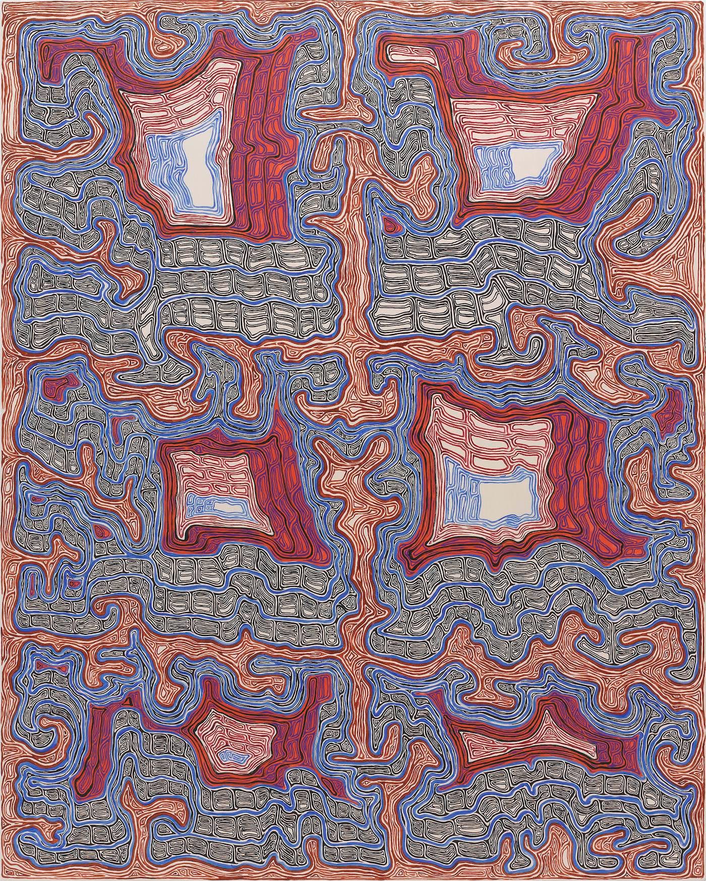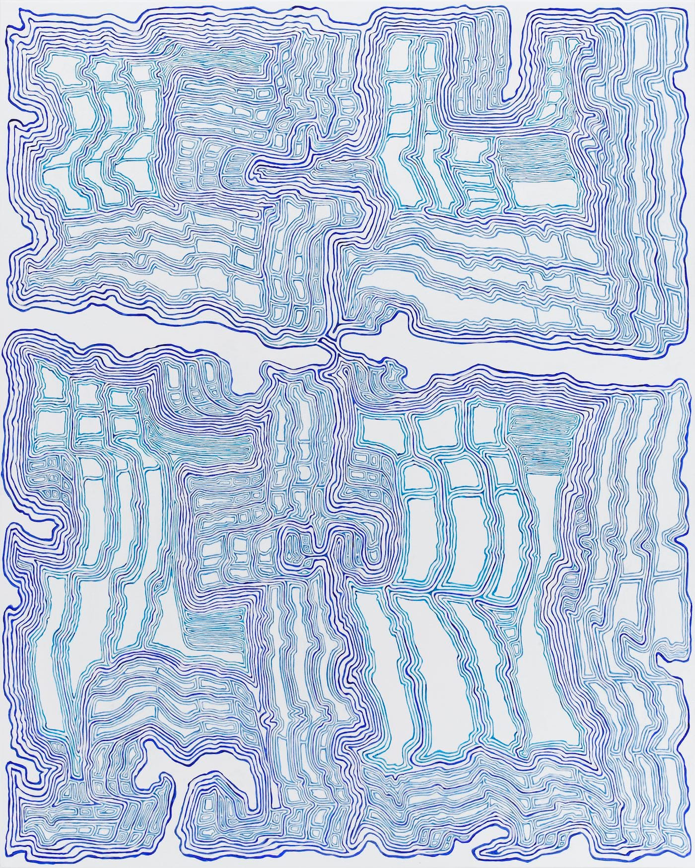 In the monochromatic “Ssonsunurrhth,” it is easy to get lost in the looking, moving closer and closer and then stepping back, never quite sure where to stand to fully apprehend the oscillating linear elements teeming across the surface. The swaying, drifting patterns of the lines are unpredictable. They conjure up the kind of circuit board found in vintage science fiction films, or perhaps Rapunzel’s hair if she happened to be swimming acrobatically, or an overloaded information map. And even as these and other associations came to mind, I realized how inadequate they were, because none of them accounted for the combination of meandering lines and dense repetition. There is something distressing about these concentrations of linear elements; the more we stare at the lines, the more unsure we become of ever being able to sort them out.