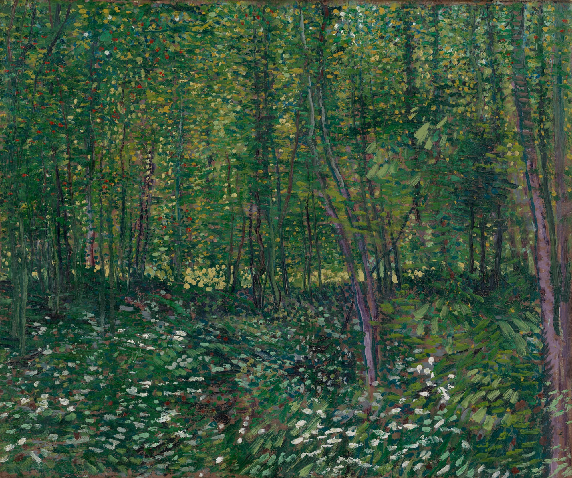 The exhibition draws parallels between low-res digital content in particular images and plein-air painting, an approach to art making which poses specific problems and opportunities to both the artist and the viewer. First and foremost, the painter who works in plein-air usually tries to have the least possible mediated experience of the surroundings, whether a nature scape or an urban environment. To see Leegte’s websites on display under the same roof with van Gogh’s paintings means to be drawn into finding a direct connection between the contemporary consumption of visual content and the Impressionist and Post-Impressionist approach to depicting the sensible world. The images generated by Leegte demand the active participation of the viewer to fill in the lack of details removed by the algorithm in the same way as “Trees and Undergrowth” (1887) by van Gogh presents just enough details to let the eyes of the viewer detect the subject of the work. In both Leegte’s compressed images and van Gogh’s paintings nature is compressed, mediated, in a way that allows the viewer to understand what has been depicted no matter how many details are removed.