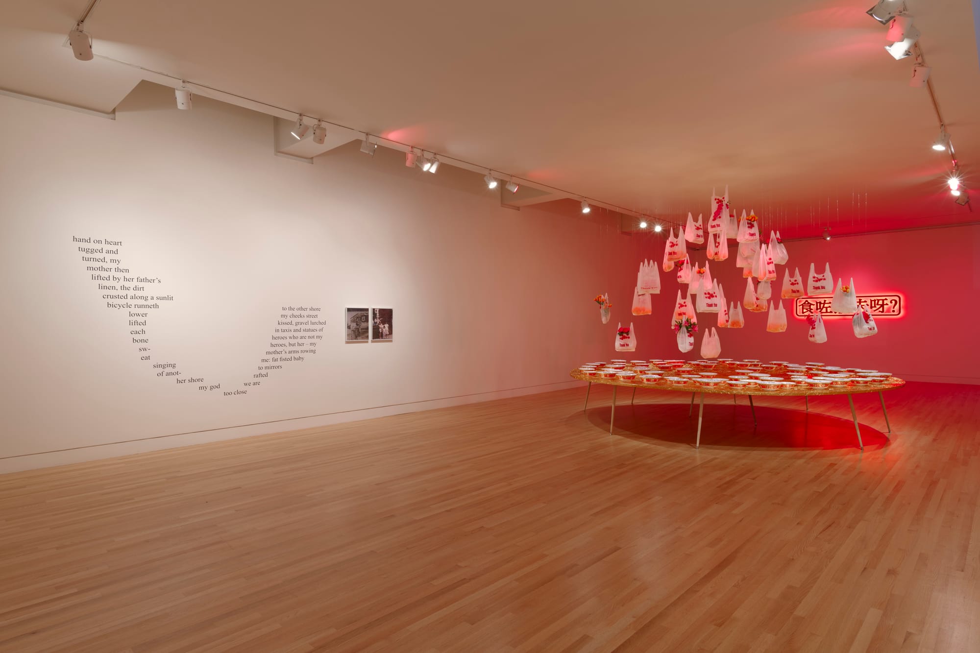 The exhibition’s strength is in Wong’s conceptual offerings, sacrifices, and moments of gratitude. The plastic “Thank You” bags float above a table with no food. An altar of uneaten crackers and oranges rests beneath poems honoring ancestral memory. By “going toward the ghost,” Wong achieves her dualistic vision; she honors histories of both hunger and abundance. In this way, her poetics of haunting encourage viewers to fearlessly consider their own family’s silenced histories. As she writes in “A Cosmology,” “I will not be afraid/ that the world is about power./ My ghosts fill me with feathers,/ my lungs: a mane unplucked.”