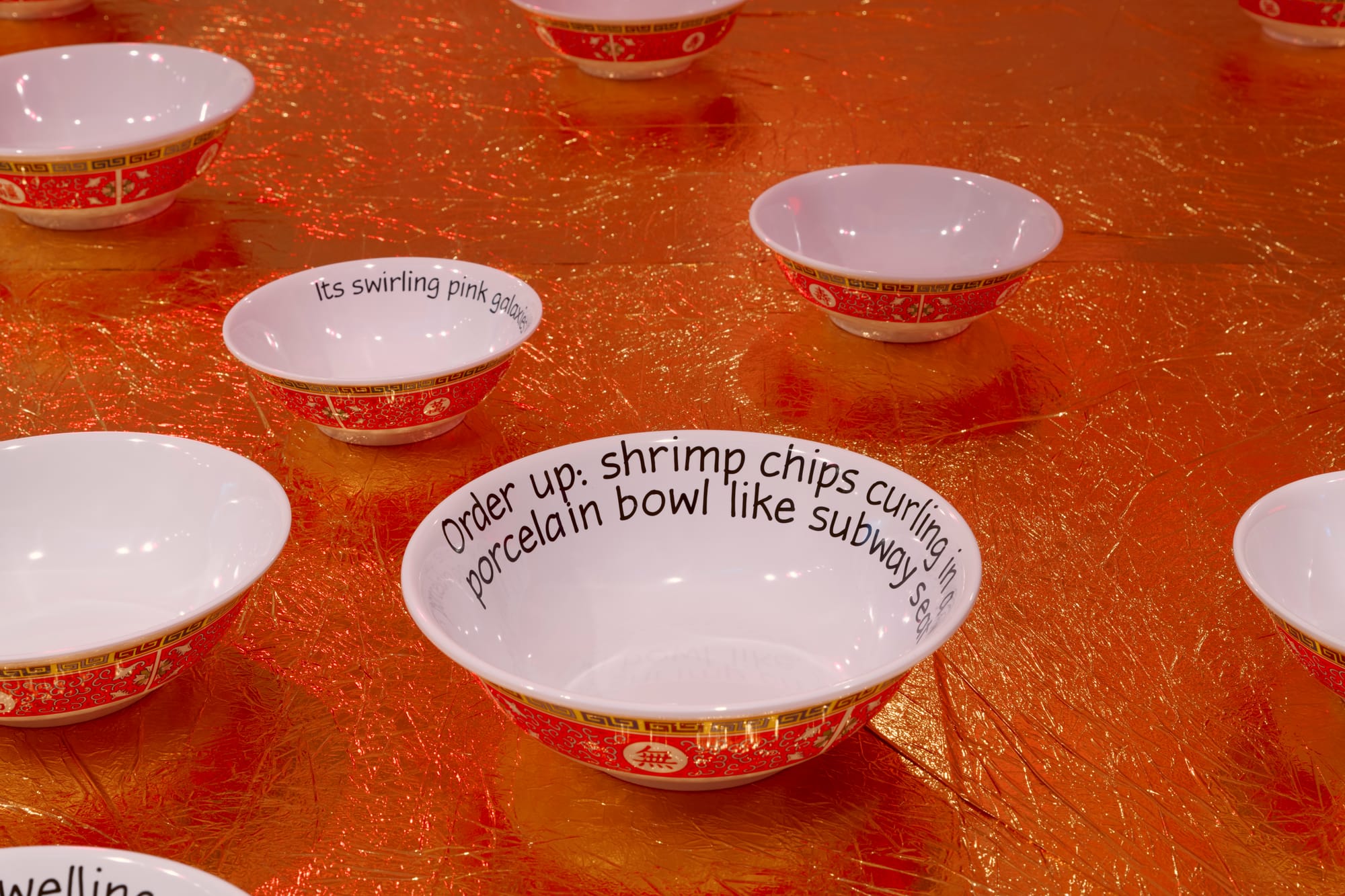 In the center of the exhibition space, “After Preparing the Altar, the Ghosts Feast Feverishly” (2019) commands attention. A 15-foot-wide table is covered in a bright gold surface resembling joss paper. Hanging above it, plastic bags brimming with fake fruit and flowers suggest manufactured abundance. On the table, bowls containing segments of vinyl text are arranged to form a poem. To read the entire poem, the viewer must circle the table, connecting each line to the next. The bowl-poem feels like an offering of fragmented, surreal memory. Lines like “the bloated sun we want to slice open and yolk/ all over the village” conjure a vivid image of hunger and desperation, while the dream of more is expressed in lines like, “globes of oranges/ swallowed whole like a basketball or Mars or whatever/ planet is the most delicious.”