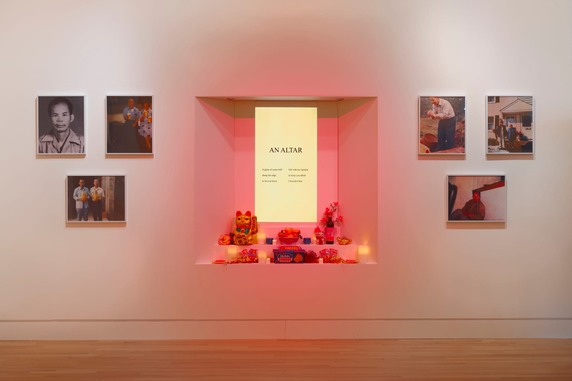Wong’s candid family photos flank “Altar.” The shots feel familiar, depicting moments relatable to many. By proposing these photographs and everyday objects as worthy of reverence, she invites viewers to recall and honor their own ancestral stories.