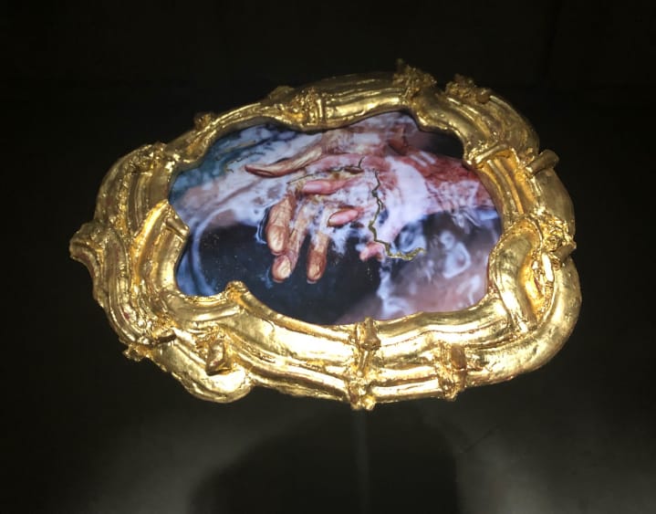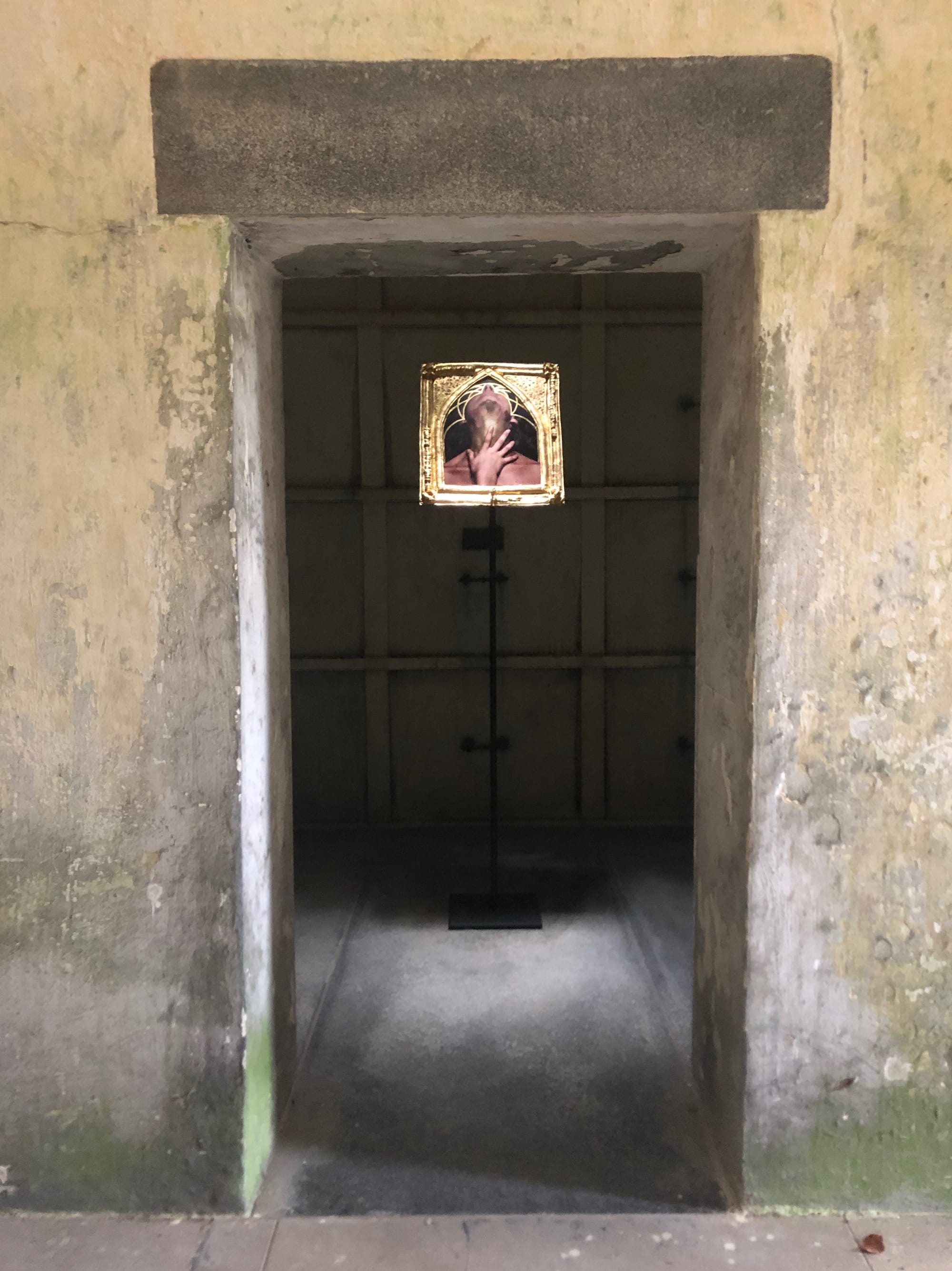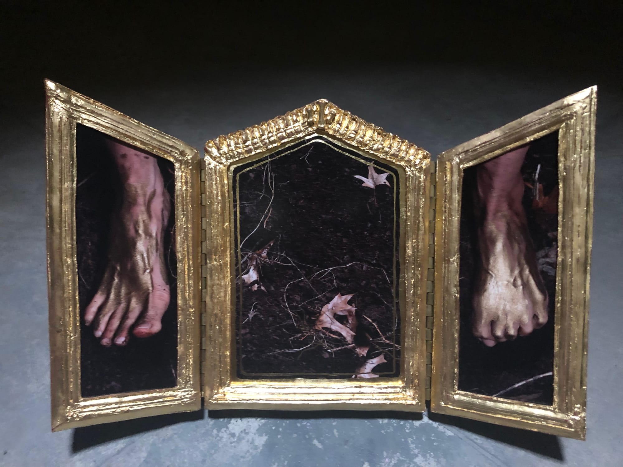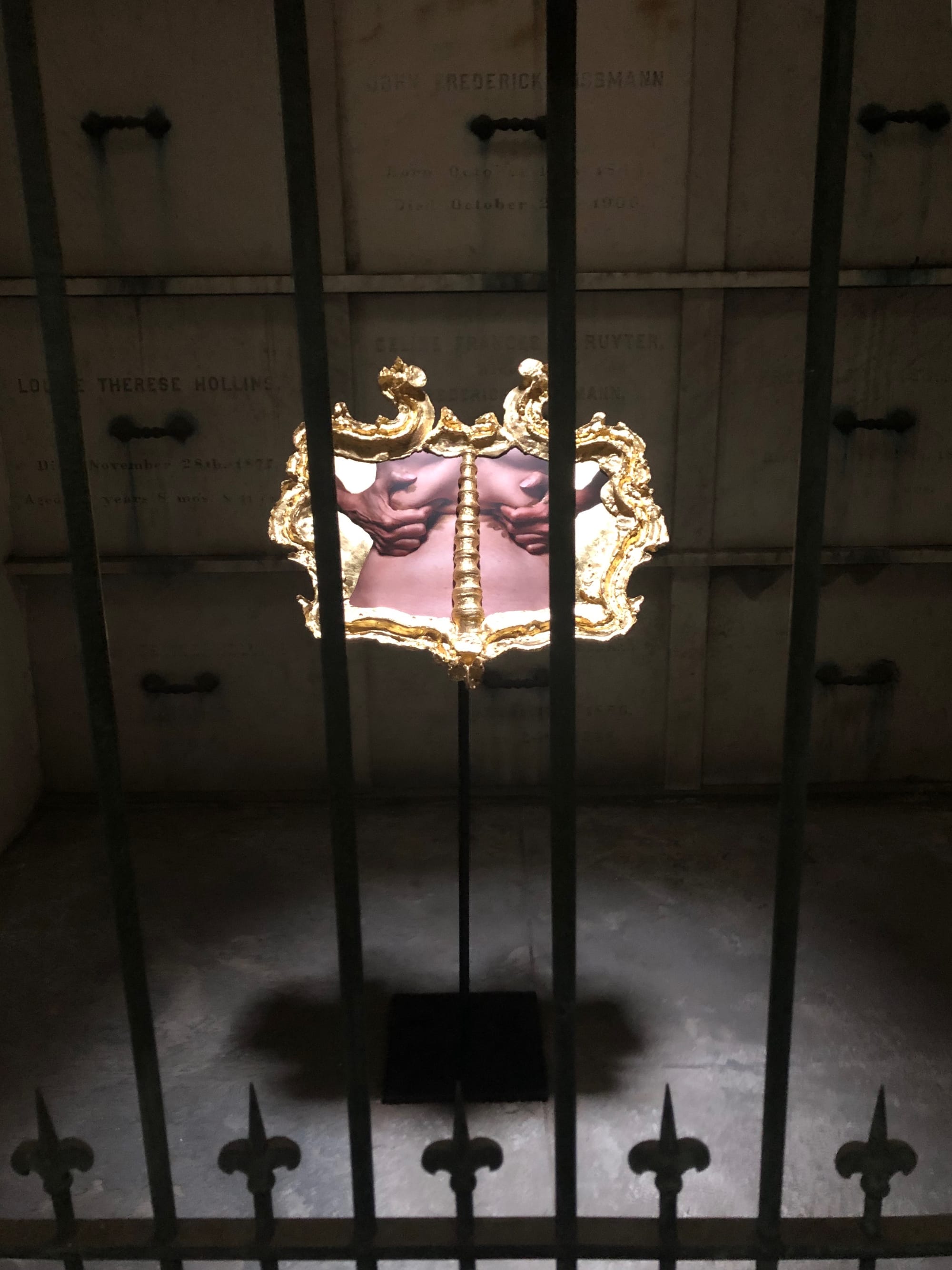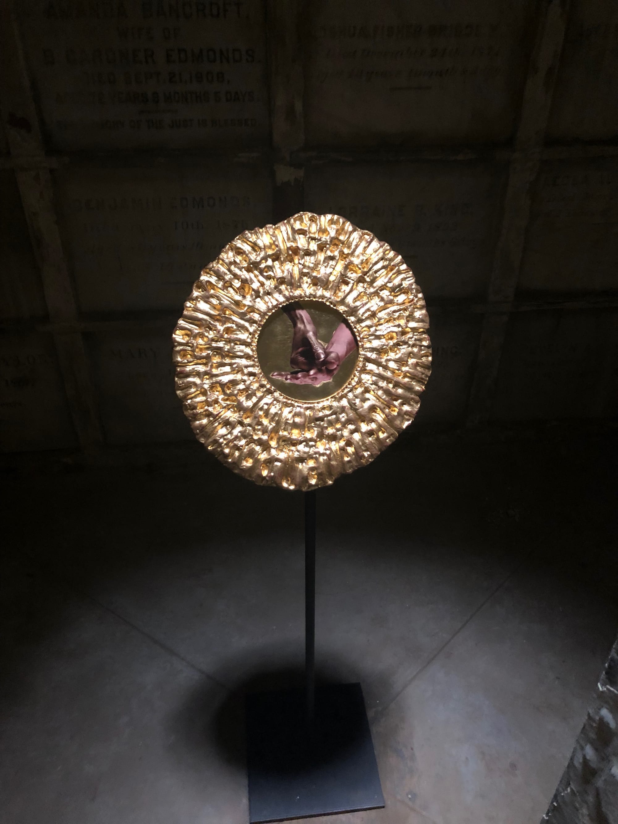 On Saturdays and Sundays from September 21 through November 17, 2019, visitors to these catacombs will encounter a group of new works by artist Janine Antoni amidst the markers to the dead. Her installation, “I am fertile ground,” comprises 9 sculptures, each situated in one of the catacombs’ 30 vaults. Each work features a close-up photograph of various body parts — hands, feet, ribs, ears — encased in an elaborate gold frame with baroque details which, upon closer inspection, appear to be molded from the bones of the body part pictured. These single images, diptychs, and triptychs, dramatically lit from the skylight above, are reminiscent of medieval reliquaries, Eastern Orthodox icons, or personal devotional objects.