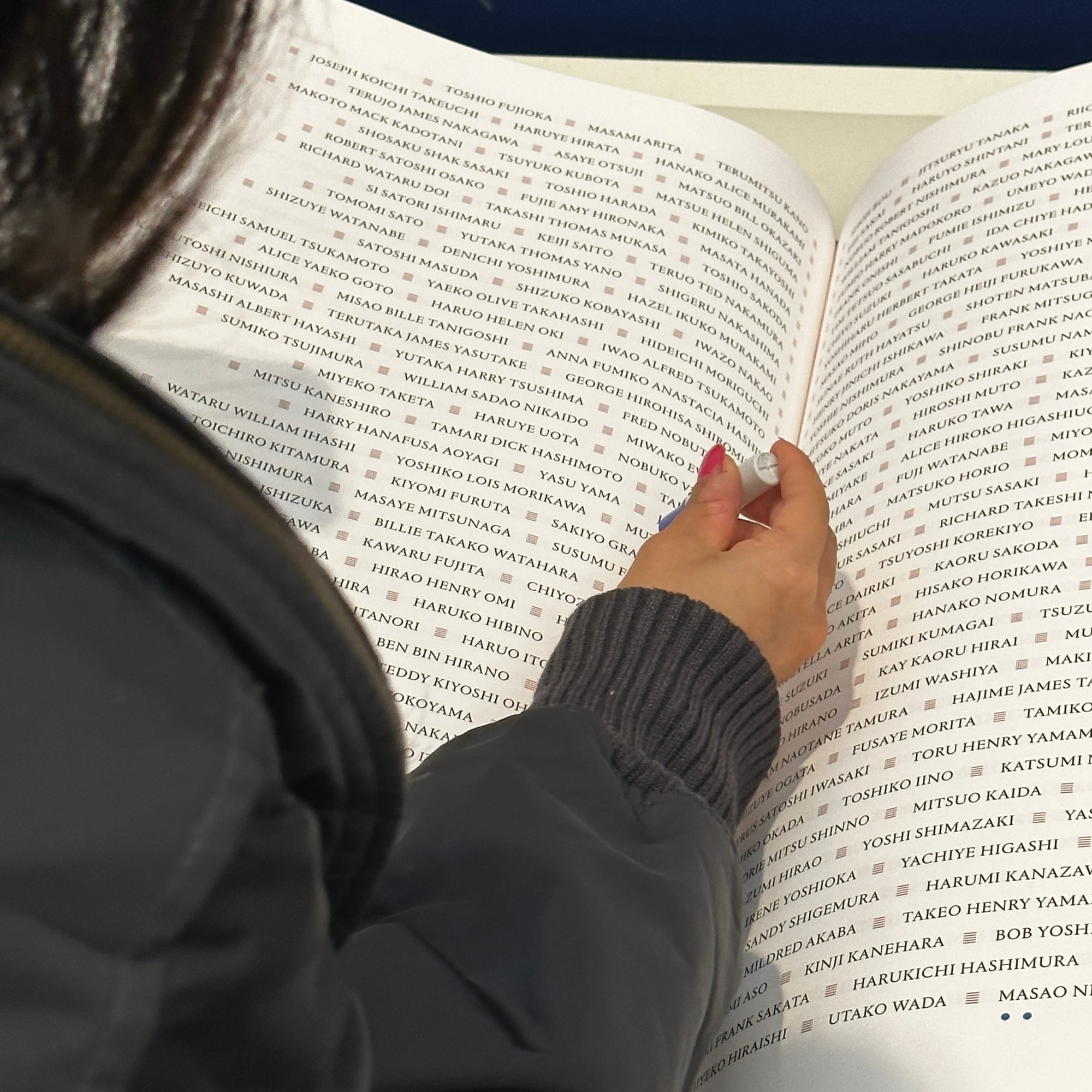 On a Saturday afternoon in October, my sister and I, with my husband and daughter, visited the museum to stamp the names of our parents and grandparents. Arriving at our appointed time, we headed to the museum’s library where we were greeted by three staff members who had already looked up our family’s names. We were then shown into a small blue alcove lined with sotoba, Buddhist wooden grave markers, each inscribed with the name of one of the incarceration sites and bearing a small vial of soil collected there. The massive book stood open on a plinth and an assistant carefully turned the pages for us, helping us find each name. The sheer heft of the book lent new gravity to the knowledge that this cruel, dehumanizing thing had happened to people we love. Seeing their names in print among so many others and touching them with the stamp suddenly made history very specific and very personal. And then we stepped outside, blinking, into the sunshine.