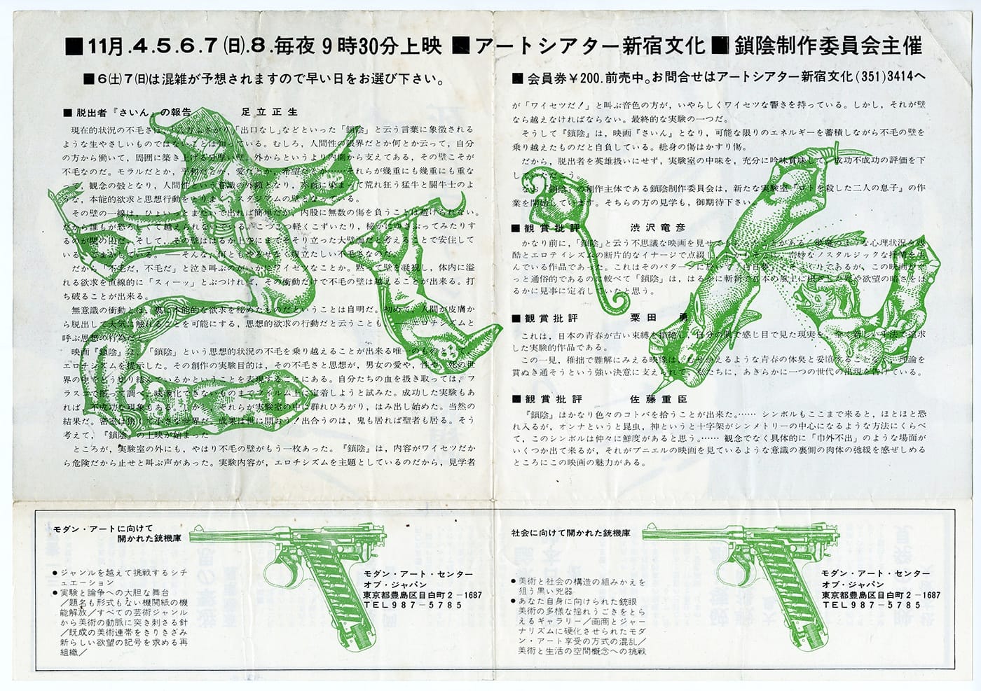 He describes a week-long intermedia festival that took place at Tokyo’s Lunami Gallery in May 1967, during which Tone, Masao, Jonouchi, Miyai, and other artists presented happenings, expanded cinema, and paintings. They tossed around the term “sogo geijutsu,” which refers to “total” or “synthesized” art forms. Elsewhere in Tokyo, underground movie theaters, clubs, bars, and galleries with names like L.S.D. or Killer Joe’s became venues for new, genre-meshing spectacles.