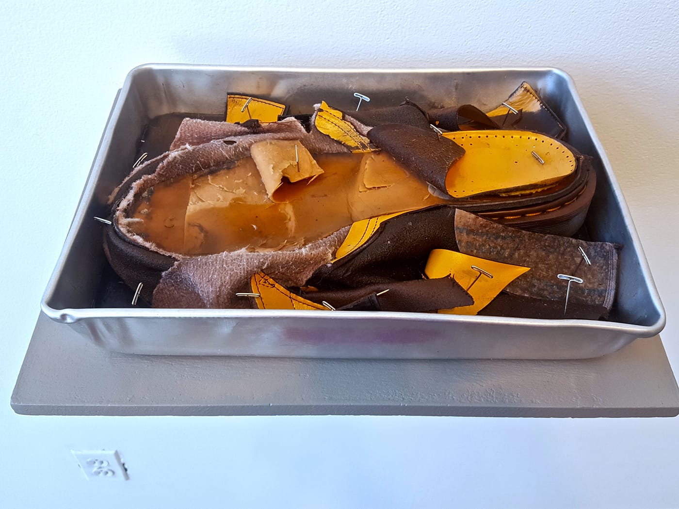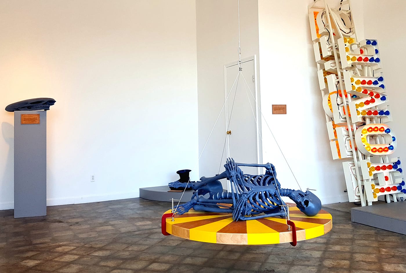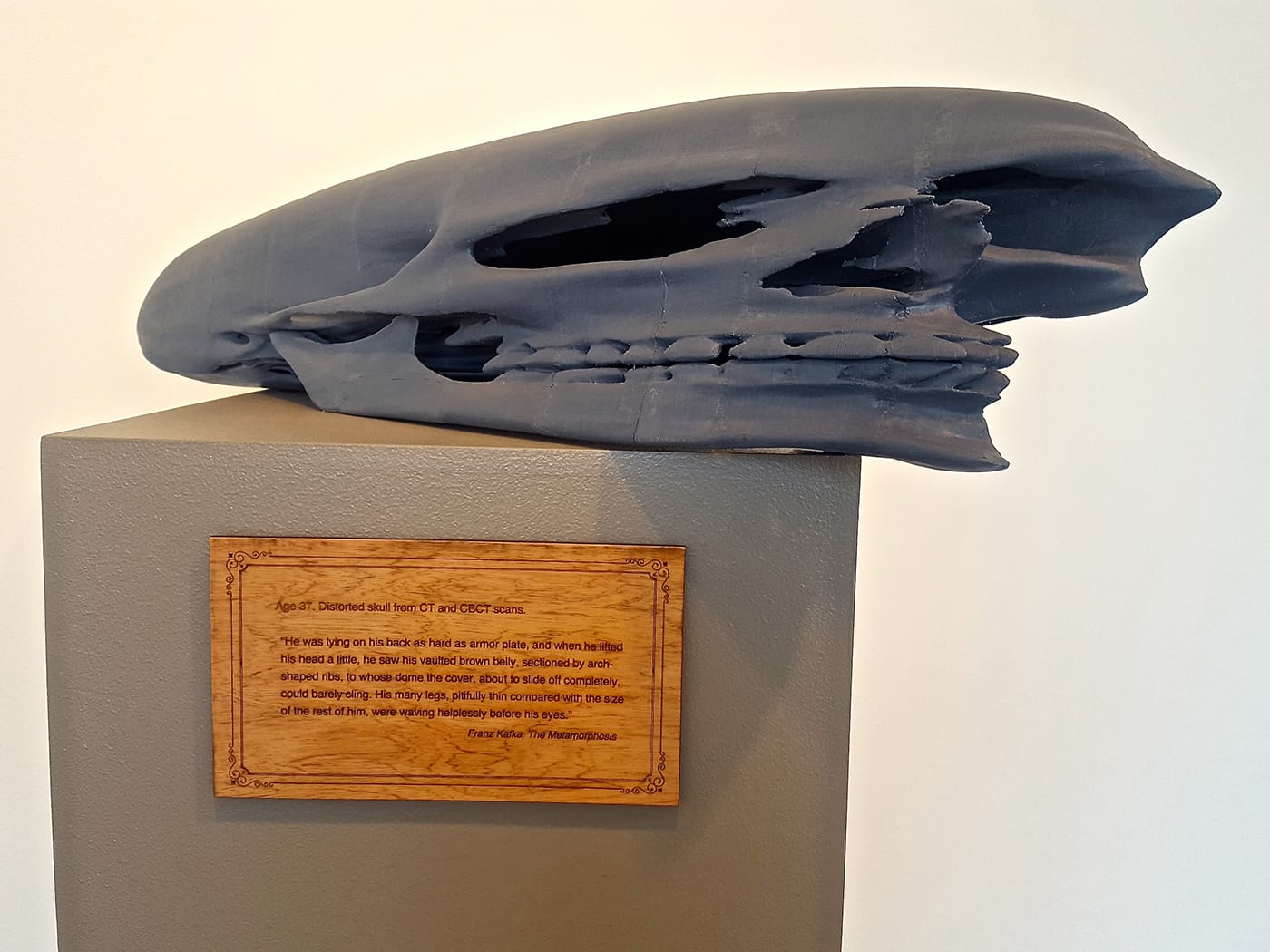 These duplicated moments extend beyond the double-entryway and immediately into the gallery, where a viewer is hailed by a grinning human skull. The endless repetition of a strange, looping strain of music, identified by Ferguson as a 10-second cut from Swedish electronica and folk music trio Detektivbyrån (“The Detective Agency”), imbues the gallery with a slightly whimsical, carnival feel. A second human skull — attached to a full skeleton that is an exact 3D-printed replica of Ferguson’s own — rotates slowly on a hanging circular platform. As you draw further into the gallery, a look back at the first skull might produce the jarring realization that what appeared to be a normally proportioned skull when viewed at the entryway, has warped into a dislocating optical illusion, inexplicably stretched and oversized when viewed head-on (Ferguson is likely familiar with and referencing the optical illusion in Hans Holbein the Younger’s famous painting, “The Ambassadors“). A quote from Franz Kafka’s The Metamorphosis punctuates this clever and disturbing transformation.