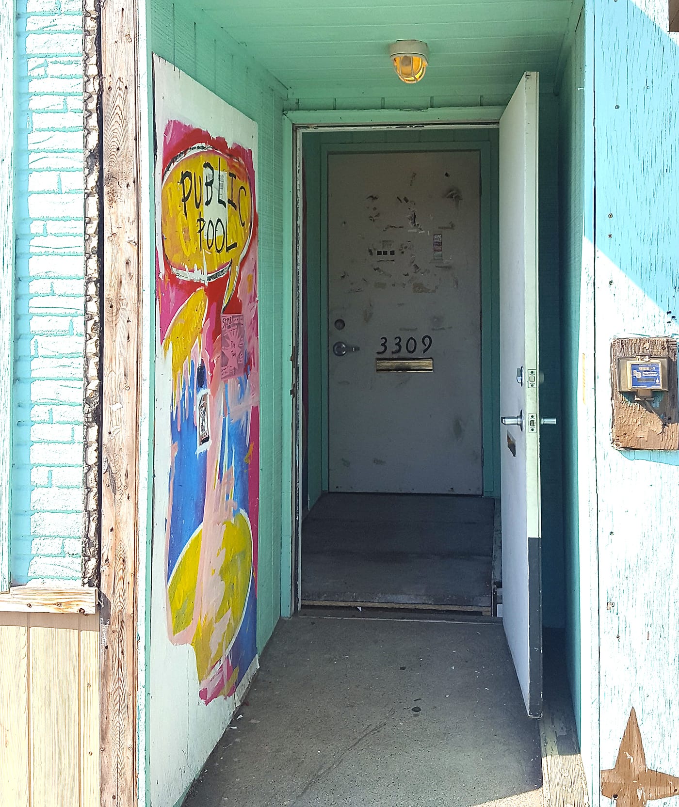 HAMTRAMCK, Mich. — Upon entering Jason J. Ferguson‘s solo exhibition, titled One-man (freak) show, the first thing you’ll encounter is the somewhat ramshackle, seafoam-colored entryway of Public Pool’s storefront gallery space and its much-abused off-white door, numbered 3309.