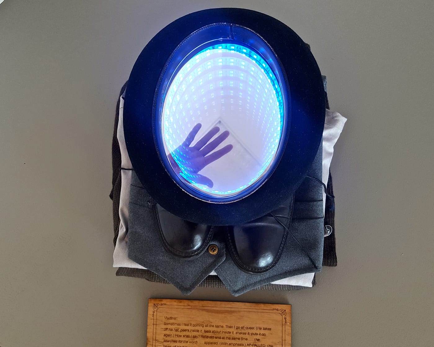 The artist went to great lengths to access the medical scanners he needed to perform the skeletal scans that enabled the creation of his spinning avatar, driving to Chicago at a moment’s notice (and mysteriously getting a doctor’s note for his request). The effort and professional acumen that Ferguson brings to his works have the feel of Christmas morning: someone has worked extremely hard behind the scenes to create a sense of wonder, illusion, and excitement. In one corner, a neat pile of clothing is topped with an upside-down bowler hat rigged with an illusory tunnel of mirrored lights so compelling that a gallery visitor had to be discouraged from trying to pick it up.