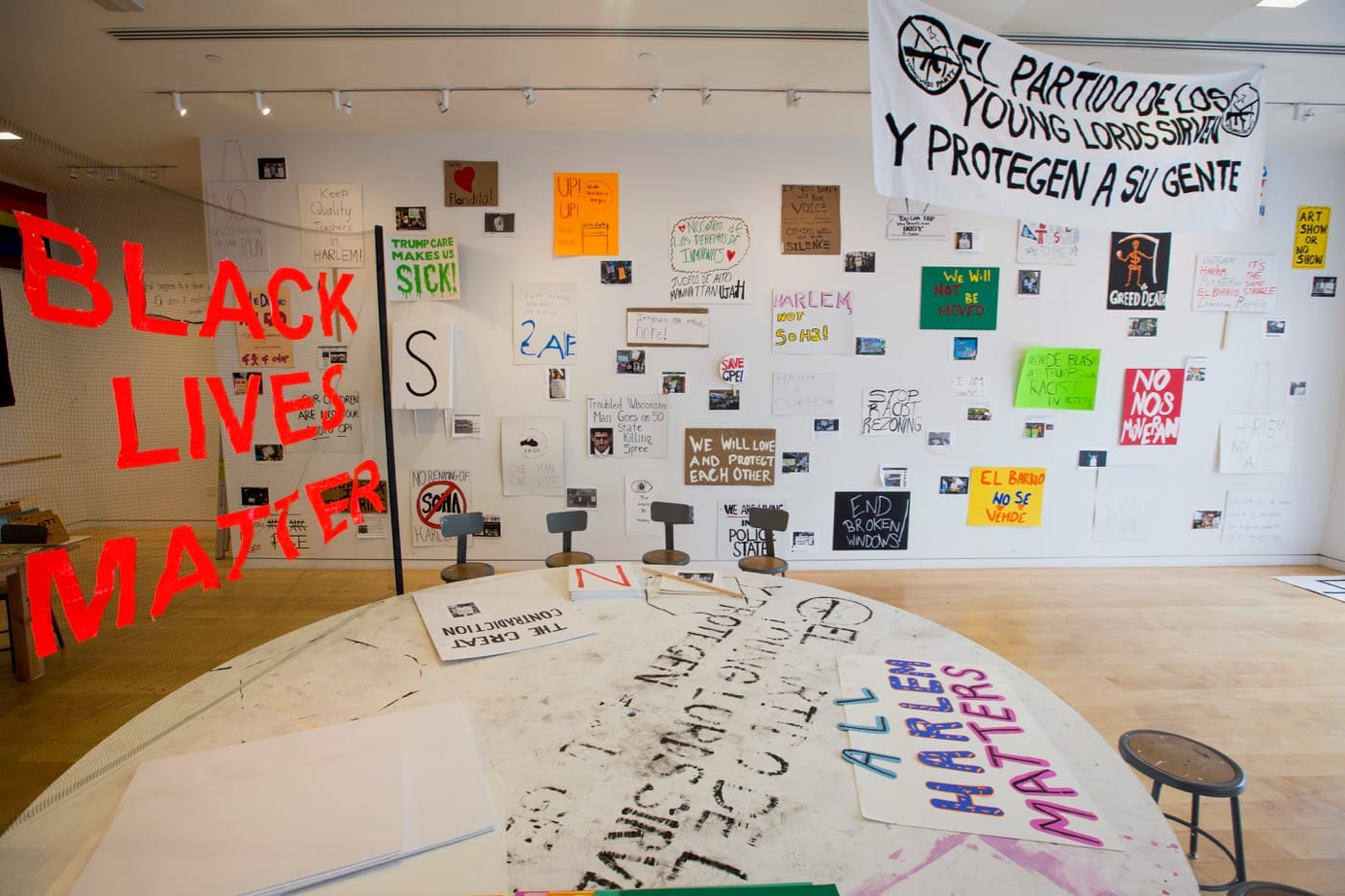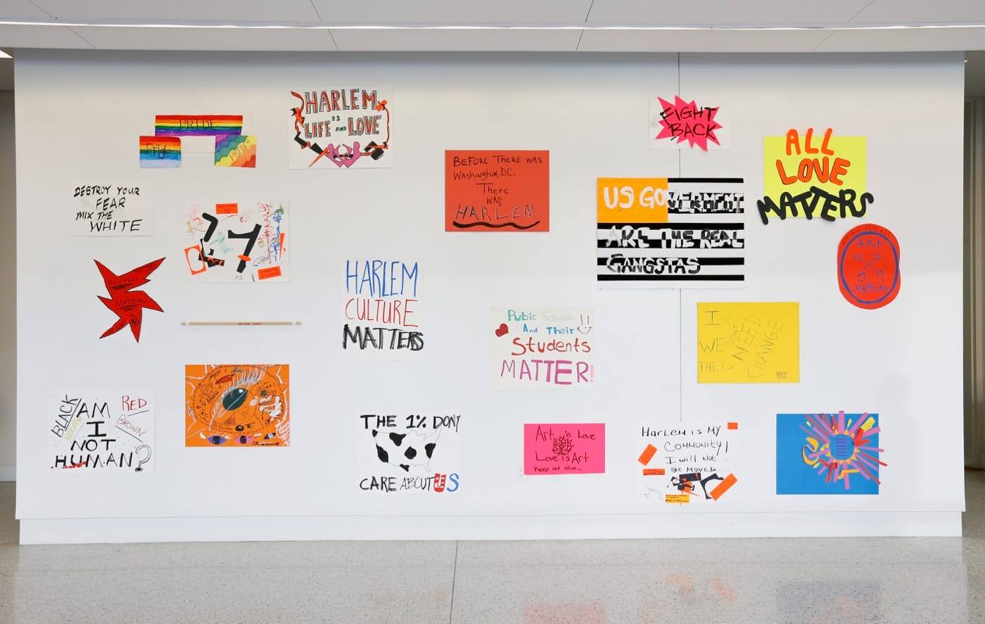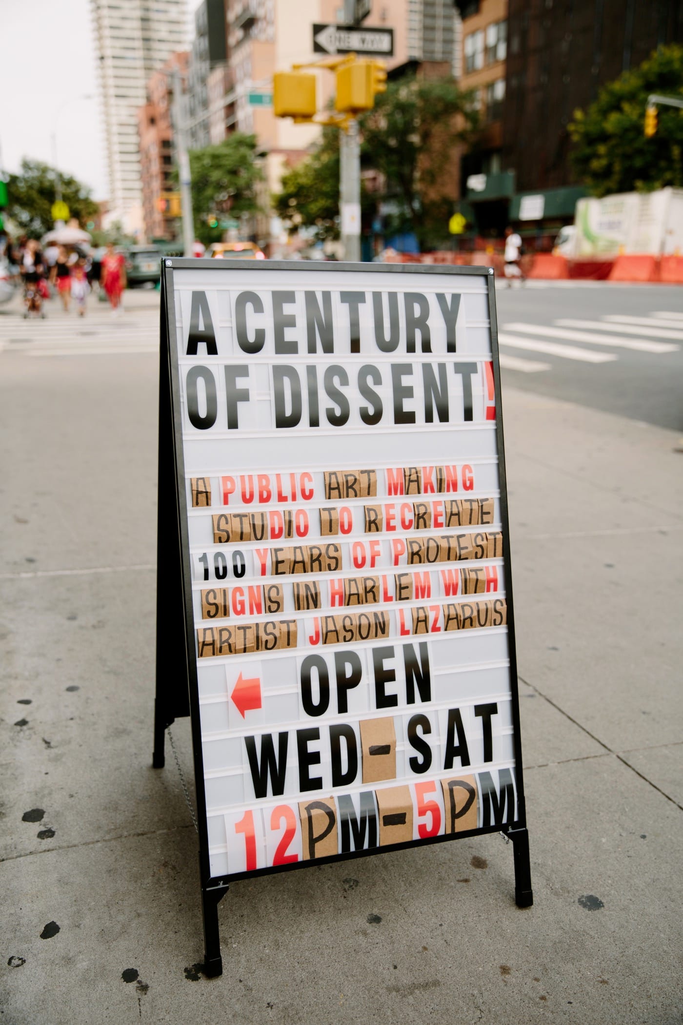 I believe that in most, if not all protests — no matter the political affiliation or the precipitating event — the protestor is essentially saying two things: “I’m here and my feelings about this issue matter.” Too frequently, the answer to that comes back from the state: “so what?” Instead of opening with this skepticism, I ask Sherman about the arrangement of the show: under Lazarus’s direction of the summer-long public art studio, participants only remake proclamations that exist in the artist’s archive of signs used in demonstrations in Harlem over the last century. I wonder whether just having volunteers reiterate what’s been said before limits the agency of the participants. Sherman’s answer is that it’s about solidarity to political causes that persist. She thinks that one can see in these signs an historical through line of concerns about affordable housing, police brutality, access to healthcare, and economic equity.