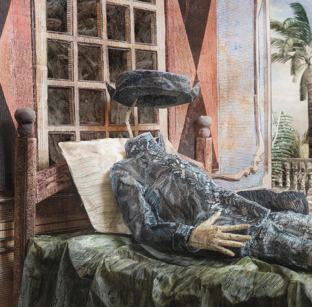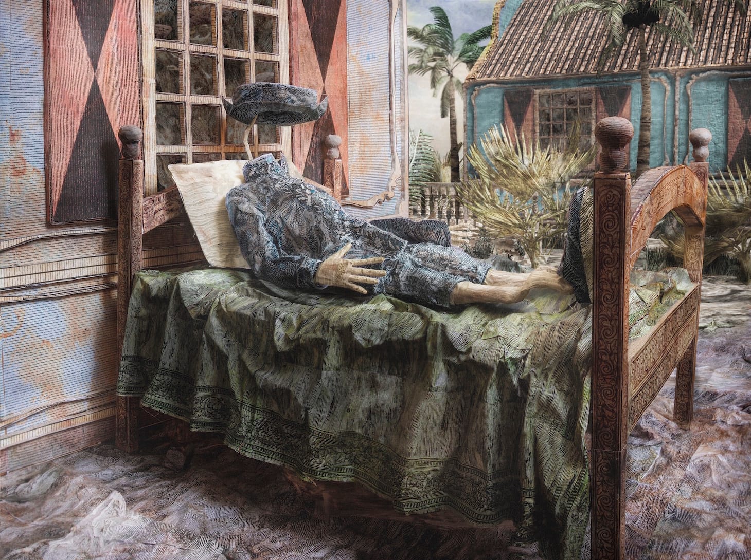 In “Brigadier” (C-Print, 39.37 by 52.76 inches, 2019), de Beijer has photographed a headless figure lying on a bed that appears to be outside. The shutters on the window behind him are geometrically divided into four triangles, echoing the emblem on the containers in “Refinery.” The brigadier’s uniform and skin have been brought into clarity by the highly detailed, printed surface that de Beijer has applied to his carefully built-up volumetric form.