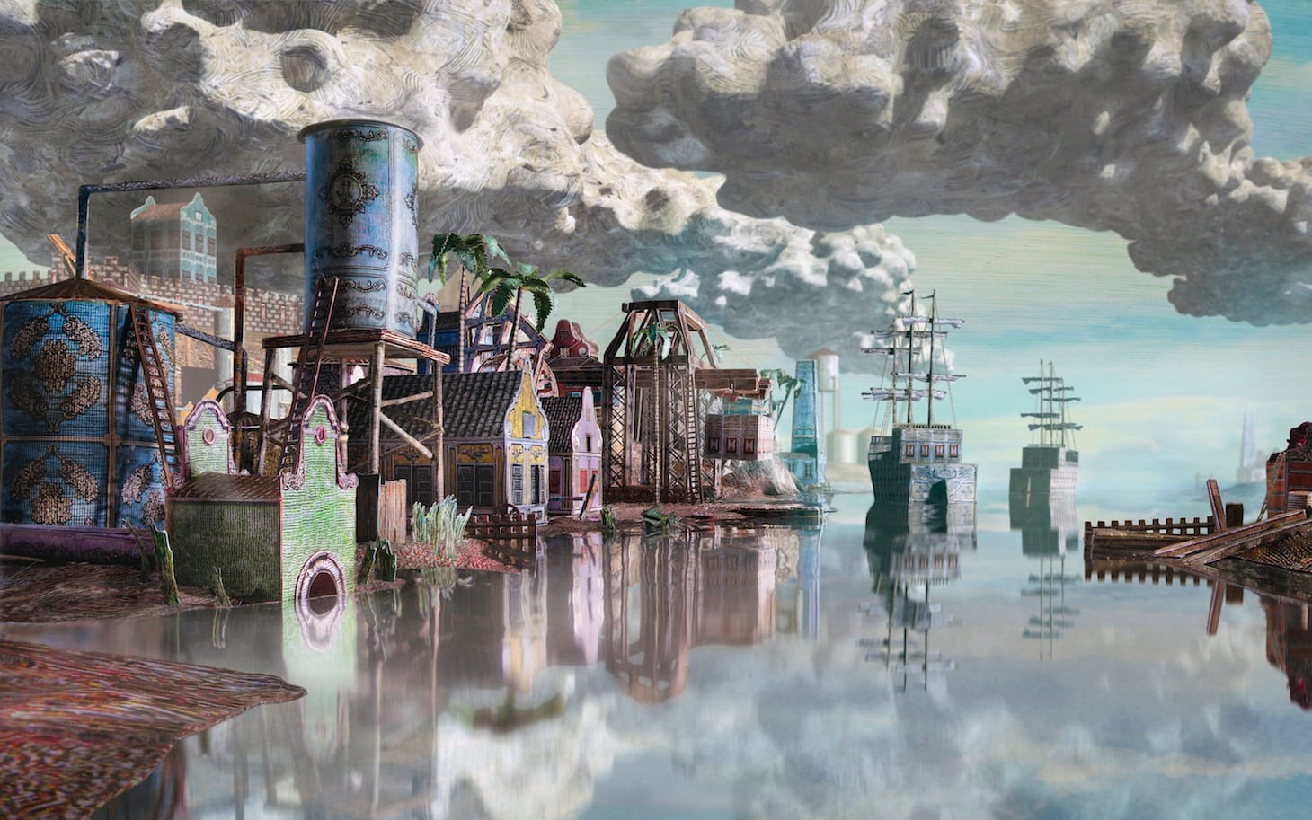 By constructing a highly detailed world based on historical events, de Biejer gives himself permission to ponder the past through his constructions, connecting and juxtaposing unlikely things and events. In “Refinery” (C-Print, 41.75 by 67 inches, 2020), he collapses together aspects of Curaçao’s past and present. Two galleons, their sails rolled up, are anchored in the distance. Further on, we see oil storage tanks on a separate piece of land.