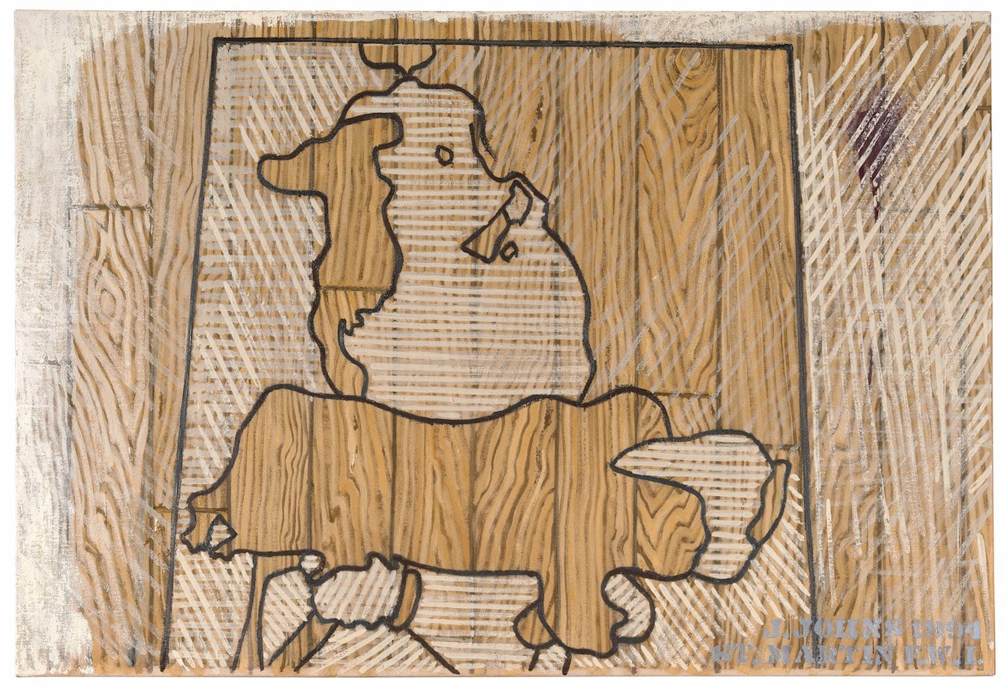 One of Johns’s processes is to trace an image and then alter it, while maintaining its exact contours. The changes that he makes to his source material are in keeping with a well-known note that he made in his sketchbook: “Take an object / Do something to it / Do something else to it. [Repeat].”