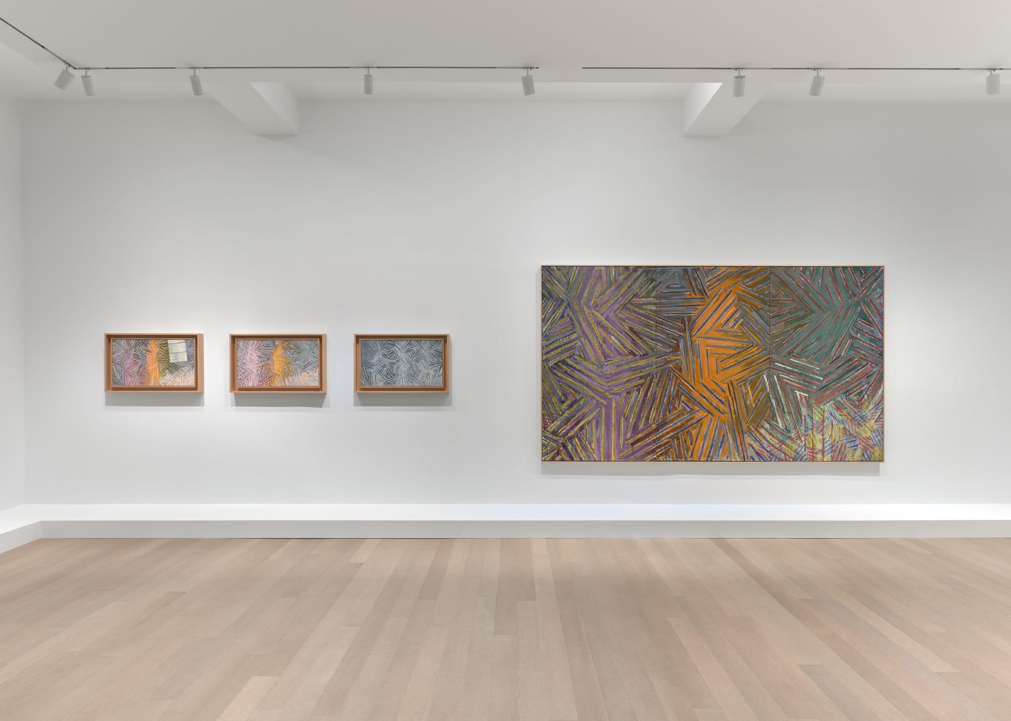 From 1972 until 1982, when he completed the trompe l’oeil painting “In the Studio” (1982), Johns was preoccupied with the crosshatch in his work, and what he could discover and convey through repeating and reorienting a cluster of unequal parallel lines that evoke both mechanical repetition and human obsessiveness. It is this decade of Johns’s work that Between the Clock and the Bed focuses on. In the paintings, works on paper and vellum, and prints on display, we are invited to engage with Johns’s relentless exploration of the relationship between an individual’s mind and body as they live in time, as well as reflect upon the gamut of feelings held in these works of extreme compression, layering, and repetition.