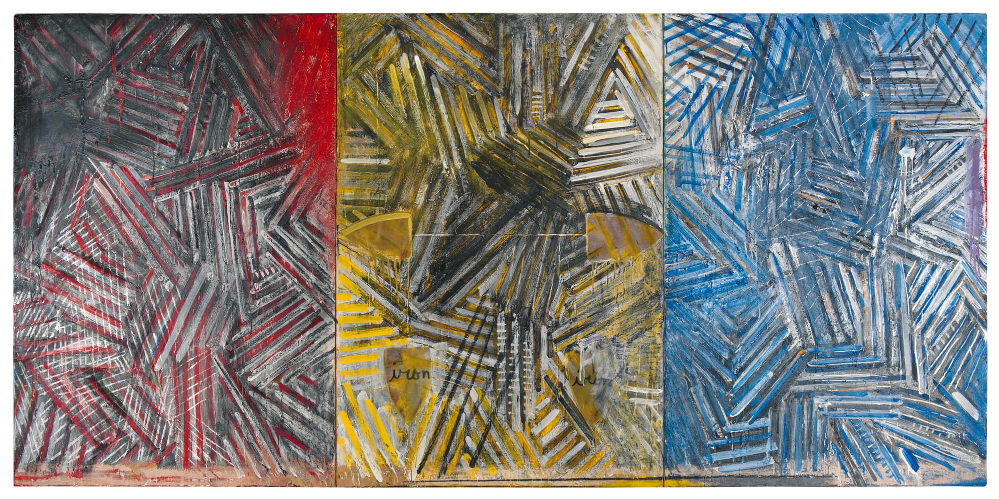 In “Weeping Women” — the title alludes to Picasso’s “Weeping Woman” (1937), done after the bombing of Guernica by the German Airforce — Johns uses the crosshatch and subdued primary colors to suggest three frontal portraits of a woman. In contrast to Picasso’s use of the double-hatched line to depict figures, which he does not shed as he approaches abstraction, Johns uses layers of crosshatching to move toward figuration without abandoning abstraction. Both artists push toward the border separating abstraction and figuration without crossing over. By coming at it from the opposite direction, Johns inhabits and understands what Picasso does in his proto-cubist work without imitating him. He stays true to himself, while adhering to the rigidity of his marks.