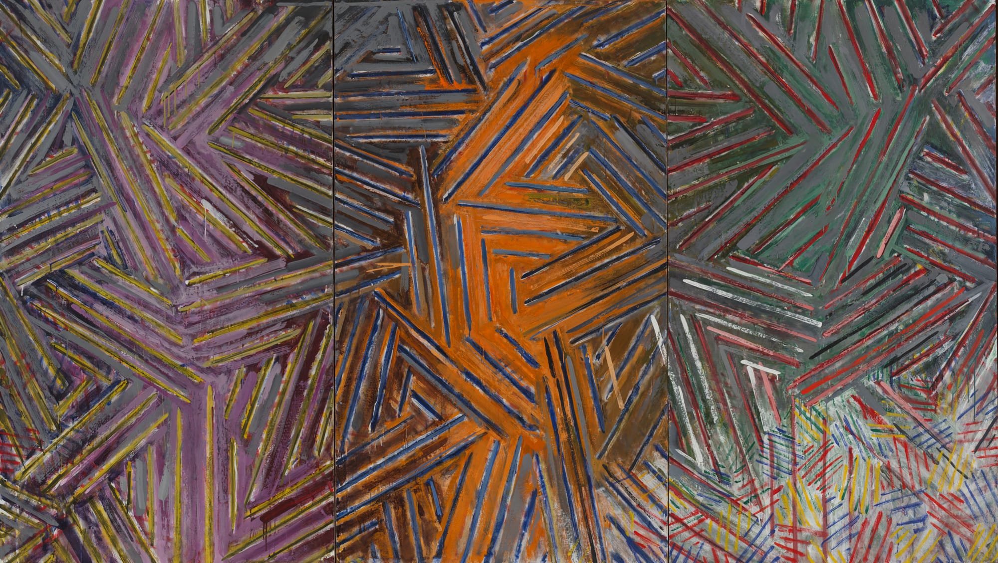 Johns’s three large paintings titled “Between the Clock and the Bed” (two 1981, one 1982), after an eponymous 1940–43 work by Edvard Munch, all on view in the Gagosian exhibit, marks another change, as he develops a different way to approach the figure without crossing over. Here, the title evokes the absent figure. Together, the glowing orange shape with blue cross-hatch lines in the middle pane coalesces into a figural presence. The combination of the orange area and the orientation of the blue lines suggests, ever so slightly, that the featureless presence is walking toward the bed.
