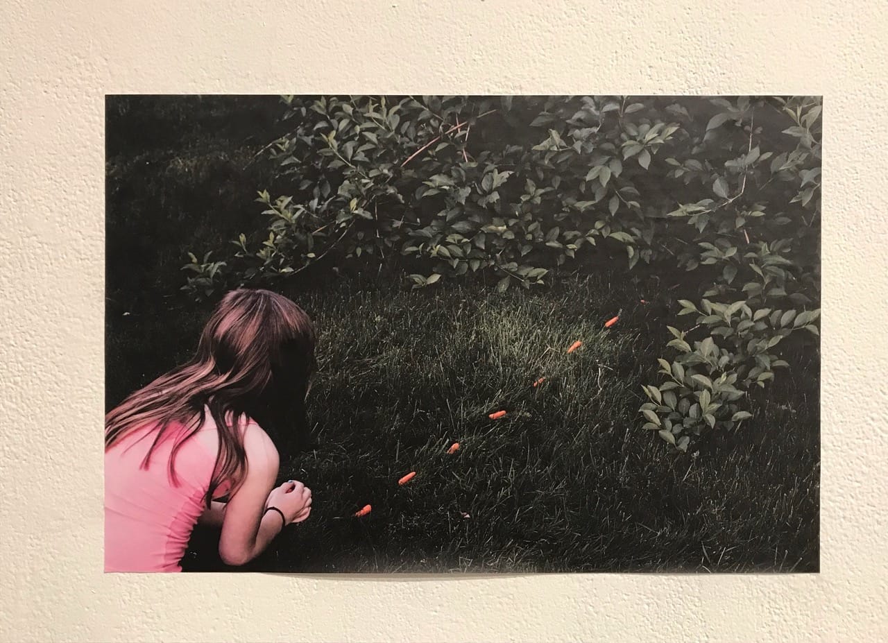 Muhlin seems to acknowledge and even revel in the unease photography can produce: one of the first photographs on display depicts a cat (a recurring compatriot of the girl) sitting on top of a stack of tomes whose titles — including The Anxiety of Photography; Memories, Dreams, Reflections; Documentary Storytelling — allude to the ambiguity of the rest of the exhibition, titled Kid. An adjacent photograph, which depicts this child laying down a line of carrots away from a bush, even reads like an invitation — as in, follow the rabbit hole into this show, and into this heightened, floral-scented reality.