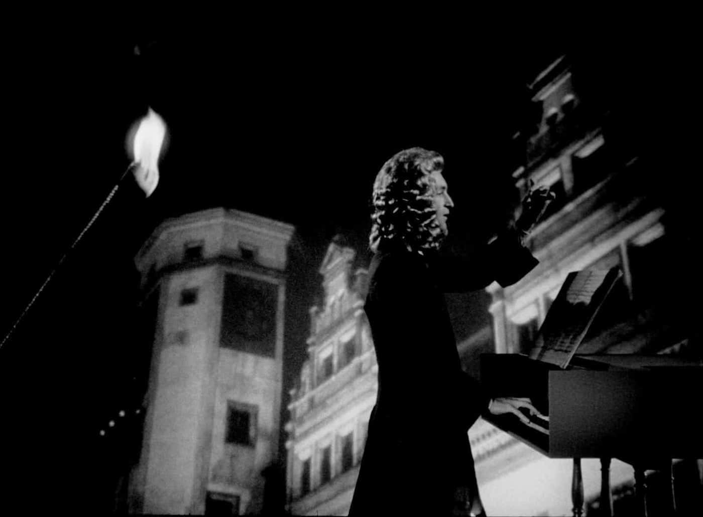 Leonhardt is first and foremost a musician in period costume. His “embodiment” of Bach is mainly through music rather than fictional anecdotes. As he plays, our eye is drawn to his fingers, to the textures of clothing and of his wig, and to the original details of instruments and architecture — in other words, to the performative aspects, which cinematic composition brings out with greater clarity.