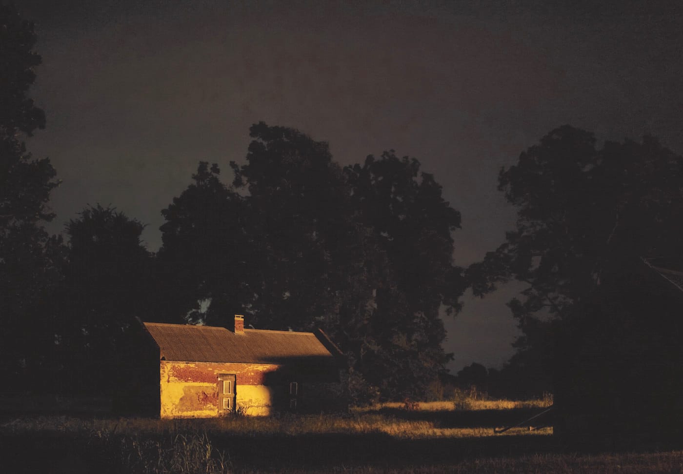 Arranged from south-to-north, the exhibit begins with a map where the artist charts the route from Louisiana to Canada captured in the photographs. Some of the photographs, such as “Decision to Leave,” which features Magnolia Plantation in Cane River, Louisiana, and “Look for the Gray Barn Out Back,” shot in Centerville, Indiana, feature actual sites still in operation today or places confirmed by the current occupants as former stops on the Underground Railroad. These images, which Michna-Bales scouted out during the day and shot during the night, only use light to the extent that it illuminates the frames of the buildings and surrounding foliage. While the photographs call attention to significant historic locations, they also bring into focus a looming darkness that threatens to overtake the frame, just as it overtook each passing night before breaking into a new day.