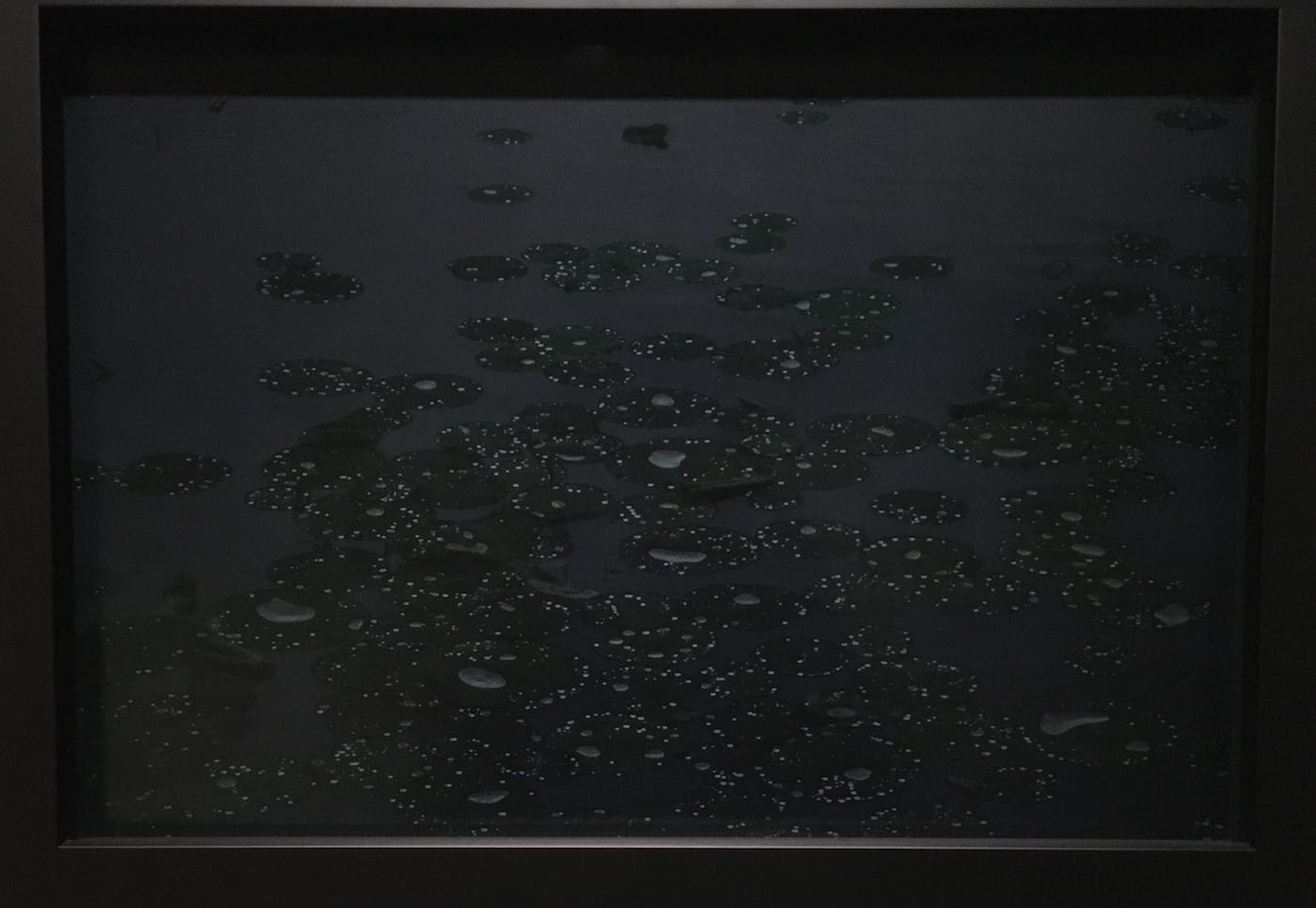 Most interesting, however, is how the well-lit map that initially previews the route sits in stark contrast to the dark images that follow it. The map crumbles in the face of black sites and black sights that it can never wholly capture; that its flattened cartography threatens to render insignificant. Photographs such as “Off the Beaten Path” and “Cypress Swamp” give texture and scope to water geographies like the Yockanookany River in Mississippi and the Middle Mississippi, respectively, where people waited and waded, where freedom seekers submerged for safety. The varied shades of blackness in these images – the blue-black of the aquatic, the brown-black of the scattered foliage, the yellow-black of the water lilies, for instance – lends them an unmatched depth that a map seldom contains. Each digital chromatic print glimmers ever so slightly with light and life, despite a persistent darkness that never fully disappears.